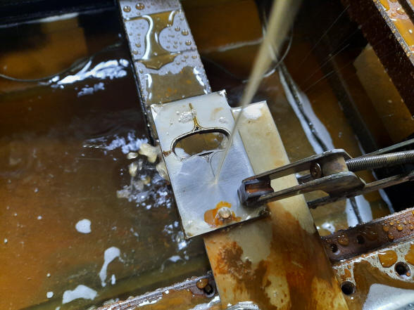 The first photo shows Buchanan using a spark erosion machine to cut a set of of