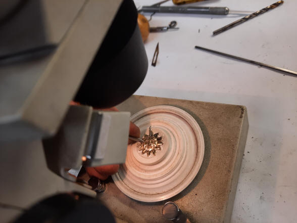 He uses a binocular microscope to finish and chase by hand the features of