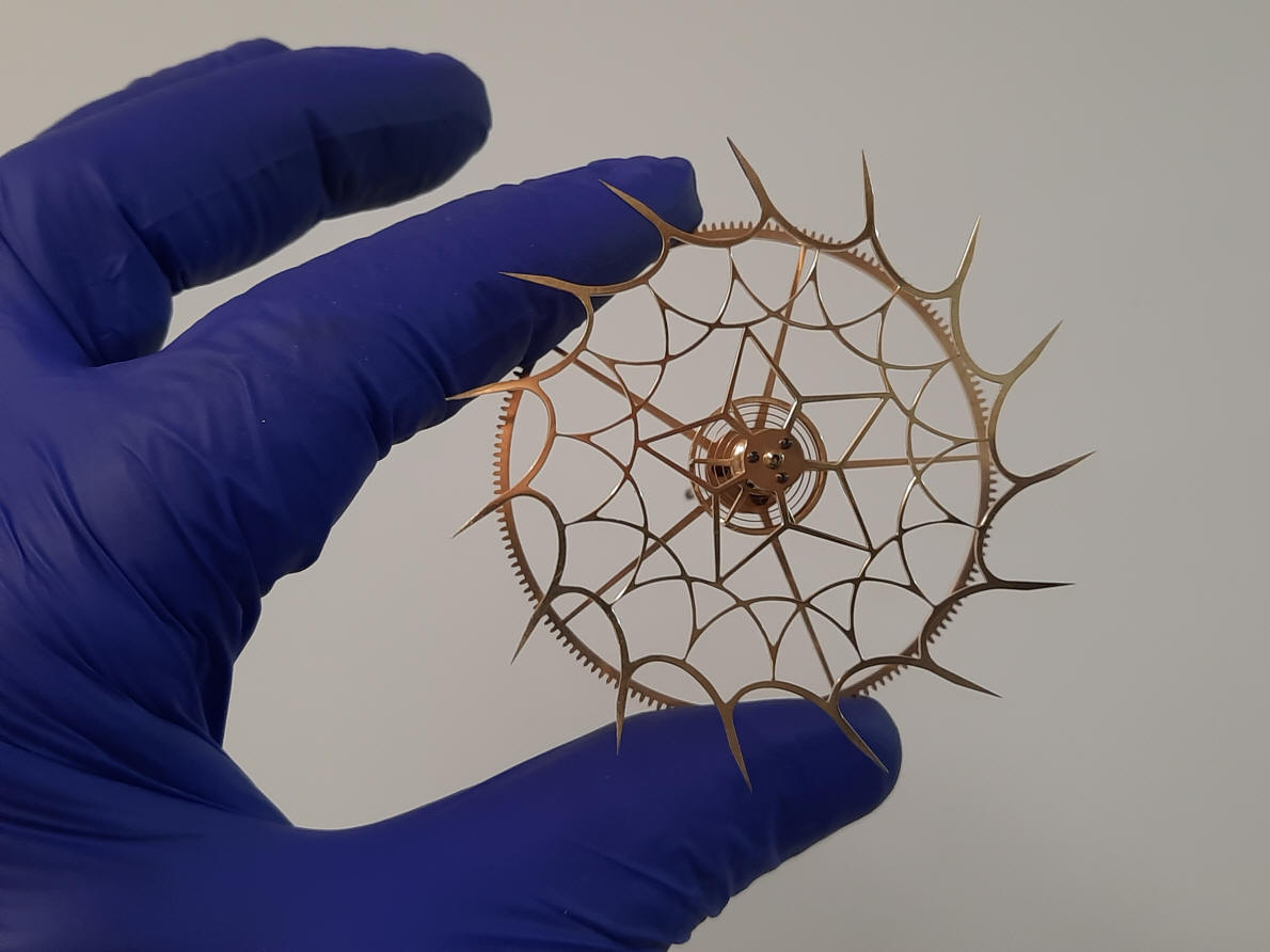 looks like an escapement wheel, but is actually an indexing wheel, is now