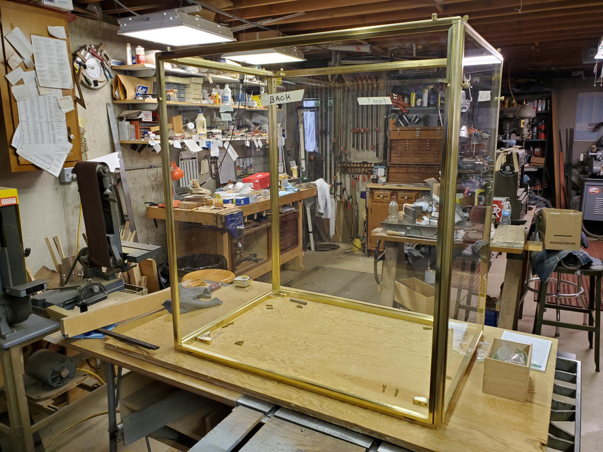 The brass trimmed case is being made locally. Fred Widman is a skilled model