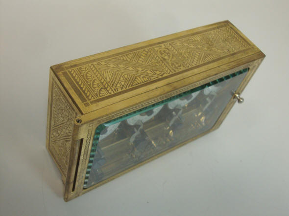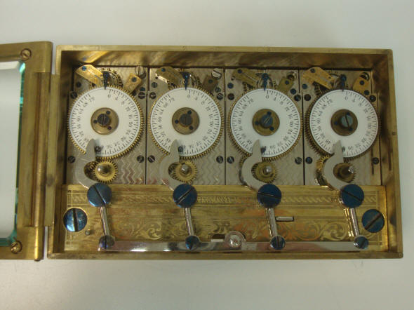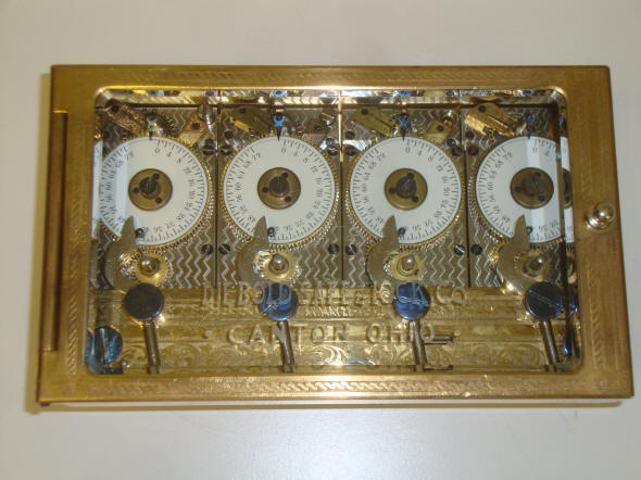 Model - Type 1, c. 1895. As with many of their other locks this company took case design to a high level. Diebold used an acid-etching method instead of the conventional milling technique to make their intricate case designs, which otherwise would be cost prohibitive. These cases were also gold plated. (see other two movement and three movement Diebold cases). These were made to coordinate with the rest of the design theme that would be found on the inside vault door surfaces. Imagine how beautiful this must have looked, industrial form morphing into art! These early models had no internal bolt mechanism, but used a bottom release lever to trip an external bolt motor mechanism. This example equipped with signed E. Howard movements. In 1902, Diebold switched to identical looking, unsigned movements made by Seth Thomas. One thing that sets this example apart is the fact that there is no patent date engraved on the snubber front piece that reads "Pat. May 22, 1894". I know of no other early examples of Diebold's locks that have the pre 1900 gold engraved cases which does not have this. About 10 examples of the Diebold four movement locks are known Case #2511. 7"w x 4.25"h x 2"d. file 161 Below a Type 1. The door is equipped with an automatic bolt opener. The time lock has later Diebold movements, c. 1950's mounted into a pre-1900's case.