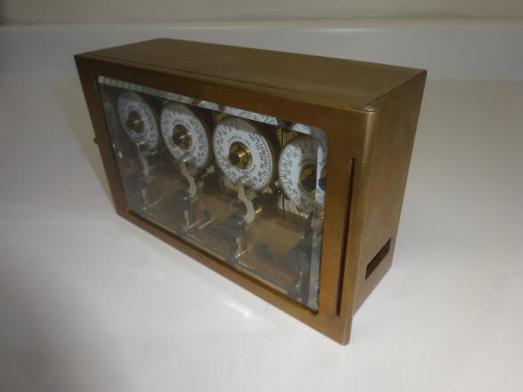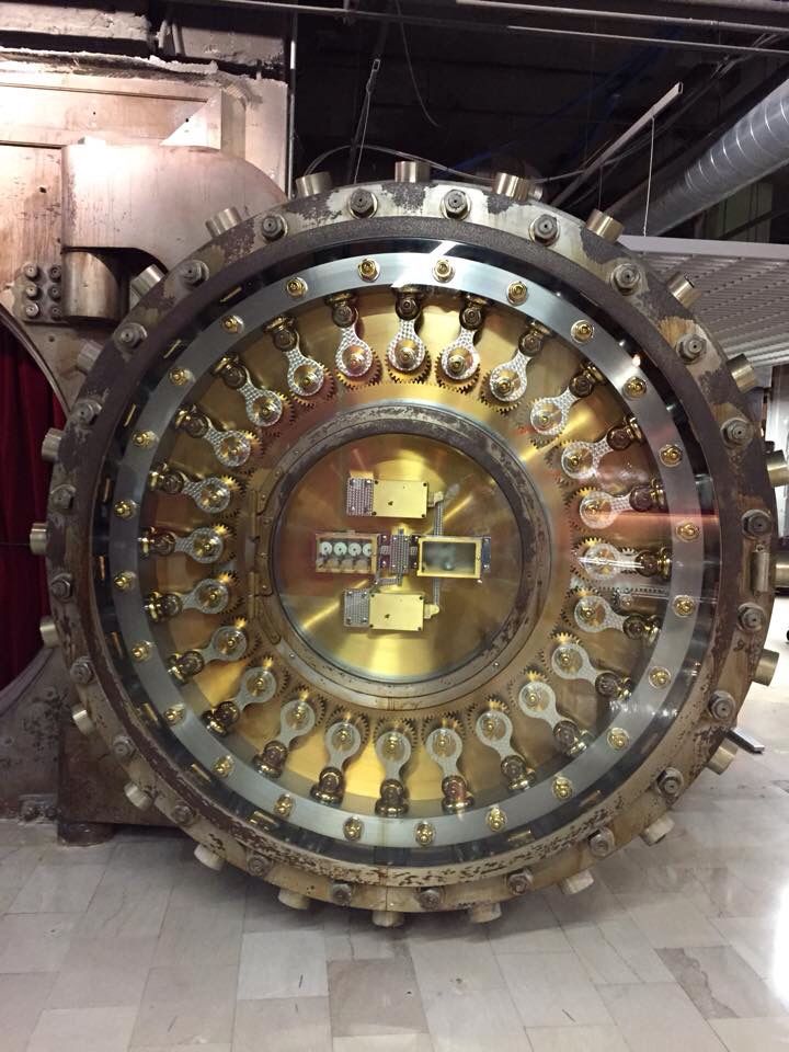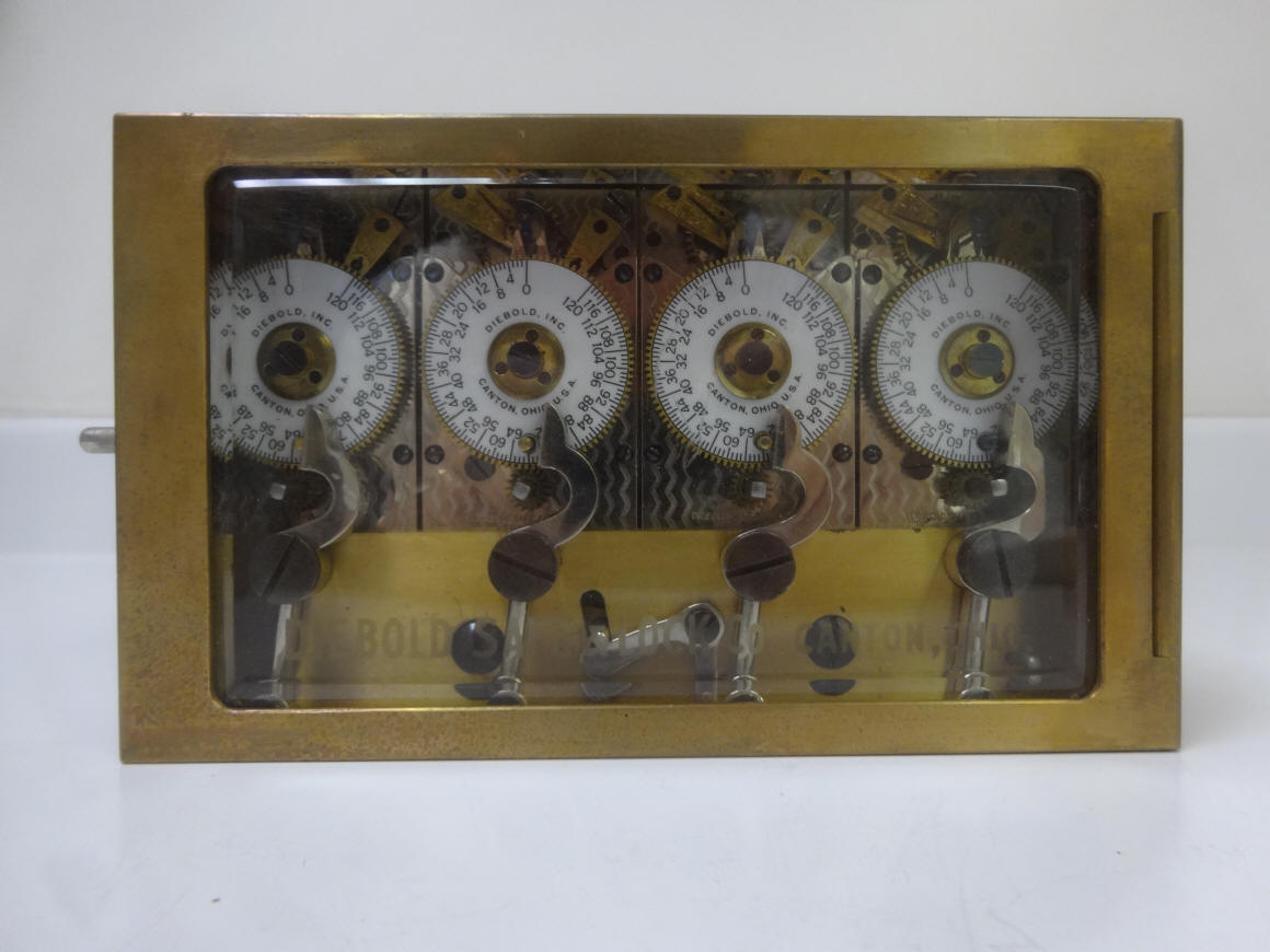 Model - Type 3, c. 1910. The Type 3 was designed to operate directly on the safe bolt works rather than with a a bolt motor as in the type 1. This lock is equipped with a rare long duration option of 120 hours rather than the standard 72 hours seen on all other versions. During this time some other manufacturers offered their time locks in an optional longer duration. Other examples are from Mosler and Yale. But it was expensive and moreover very few banks saw the need for these since 120 hours covers five full days. Only the largest vault doors would have used a four movement lock and these would nearly all be commercial banks rather than a private entity. This version was mounted to vault doors that used standard bolt work as illustrated below. That bolt work would have entered the case from the lower right hand side as seen in the fourth photo. Plain brass case with original acid-etched and beveled door glass. This is the only example of a long duration quad movement known to the author. Case #9043. 7"w x 4.25"h x 2.5"d. file 205 The photo below shows a Diebold round door with a four movement Diebold Type 1 time lock but used in an application that dogs the bolt work and the door using manually operated bolt actuation. This is a curious color combination since a brass colored Diebold lock would have been more in keeping with the design of the rest of the door. But this was obviously deliberate since the rest of the hardware is also silver colored. Compare the differences in all three of the round vault doors in the method the bolts are deployed. In the first one a rack and pinion arrangement is used. The second door uses a type of angled plunger is used to move the door bolts. It appears that three of these plungers are a bit different from the rest, perhaps a replacements. An eccentric cam design is used in the third This author would like to know why so many methods are used by the same company, what are the reasons and if these are dependant on the specific installation or other factors.