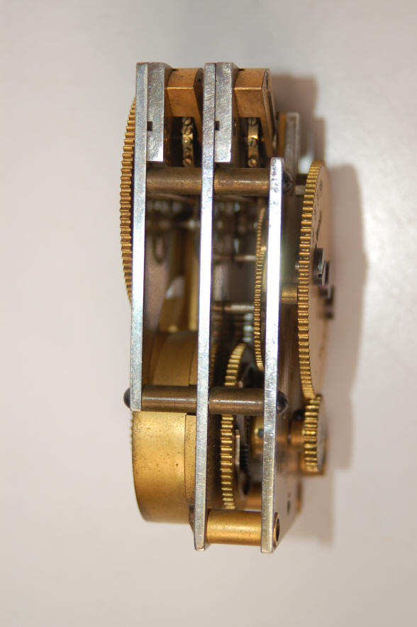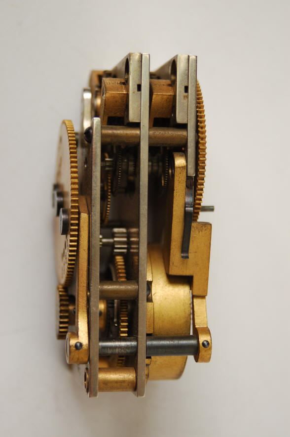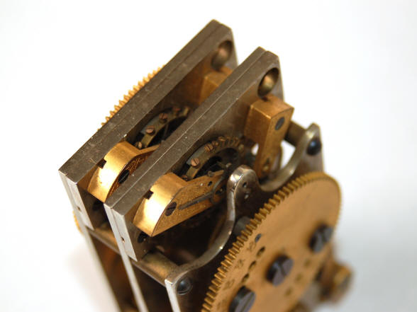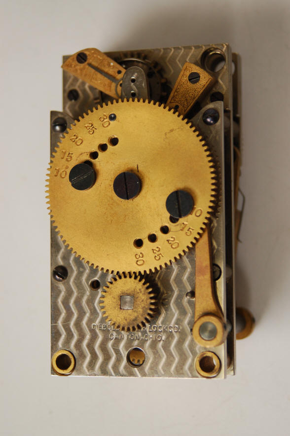 Short-term, DAT timer c.1950. Seth Thomas. The unusual feature of this movement is the use of two platform escapements within one timer movement resulting in a triple plate design. Note the front main wheel is denoted from 10 to 30 minutes in five-minute increments which is adjustable via two removable screws and the rear main wheel also has the same denoted sequence; but with a permanent pin, in this case at 20 minutes. There is no winding square for a key to directly wind the movement. One main spring and wheel train drives both escapements, each providing redundancy. This design appears to be an attempt to provide the redundancy of two separate movements, but within the confines of one movement; but must have been a failure as it does not appear in any example seen so far. Even with two platform escapements, there is not complete redundancy as the rest of the movement train is shared. This author has never seen a dual platform escapement design for a time lock before. This movement was likely a prototype developed for Diebold to test a delayed timer concept, aka a DAT time lock. In these types of locks the timer can be quickly and automatically wound and put on guard through the action of throwing the bolt for the cash drawer. The amount of time would be pre-set through the pin in the front wheel. DAT's were used to thwart daytime robberies where the thief would not have the time to wait around for the time lock to go off guard. Yale and Mosler made a variety of these types of locks. Some were put on guard by manually operated boltwork, others by spinning the combination lock dial. Diebold never produced a line of DAT time locks. file 301 |