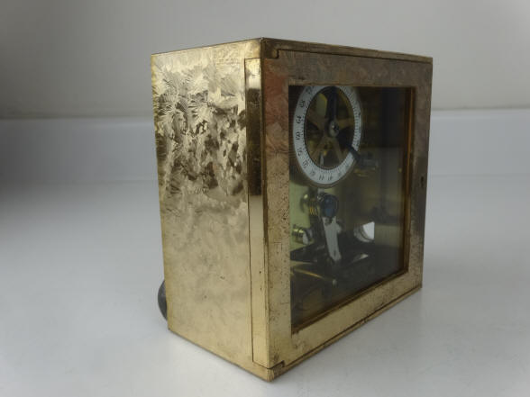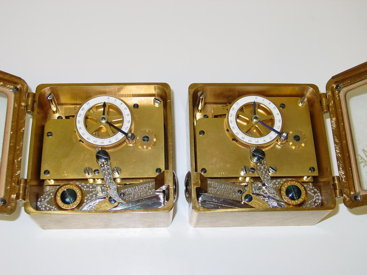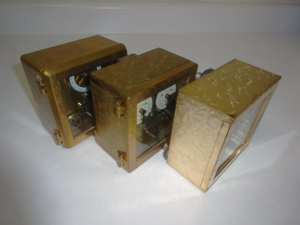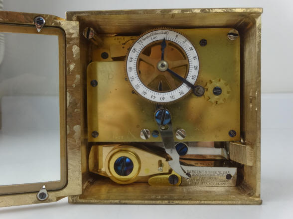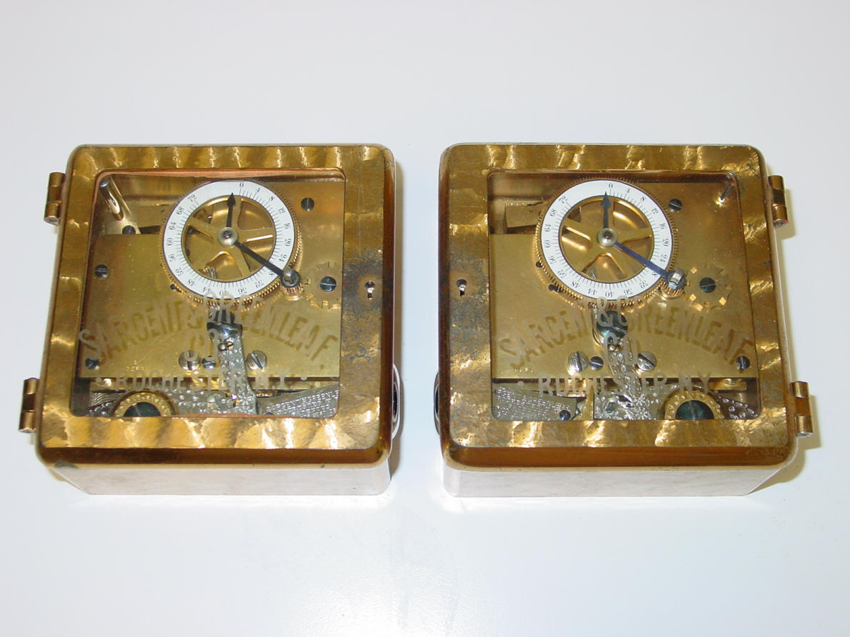 A. Model #4 - Corliss. The locks pictured were shipped September 8, 1900 according to an original S&G logbook, see below. This model was used (in pairs) exclusively in Corliss 'Cannonball' Spherical style safes. Note original etched glass which often is missing due to breakage. Sargent and Greenleaf invented the first commercially produced practical time lock and made their own movements. Most other firms, notably Consolidated, Yale, and Diebold used movements from outside suppliers mainly E. Howard & Co. Around 1902 Howard exited the time lock business when it was purchased by the Keystone watch company and Seth Thomas filled much of this business. Other time lock makers who arrived later, as Mosler Safe Co., and then Bankers Dustproof, used American Waltham Watch and Illinois Watch Company pocket watch movements. Beginning around the 1950's movement production shifted from the United States to Switzerland. Sargent and Greenleaf ceased production of their own movements due to high domestic costs in 1953. This lock has the company's jeweled (damascene) bronze case. They had two types of damascene patterns, a spotted and a more random 'crystalline' pattern. This having the latter. 4 1/2"h x 4 1/2"w x 2 3/8"d. Case and bolt 1541-2 (left), 1541-1 (right); movements 1563-2 (left), 1563-1 (right). file 110