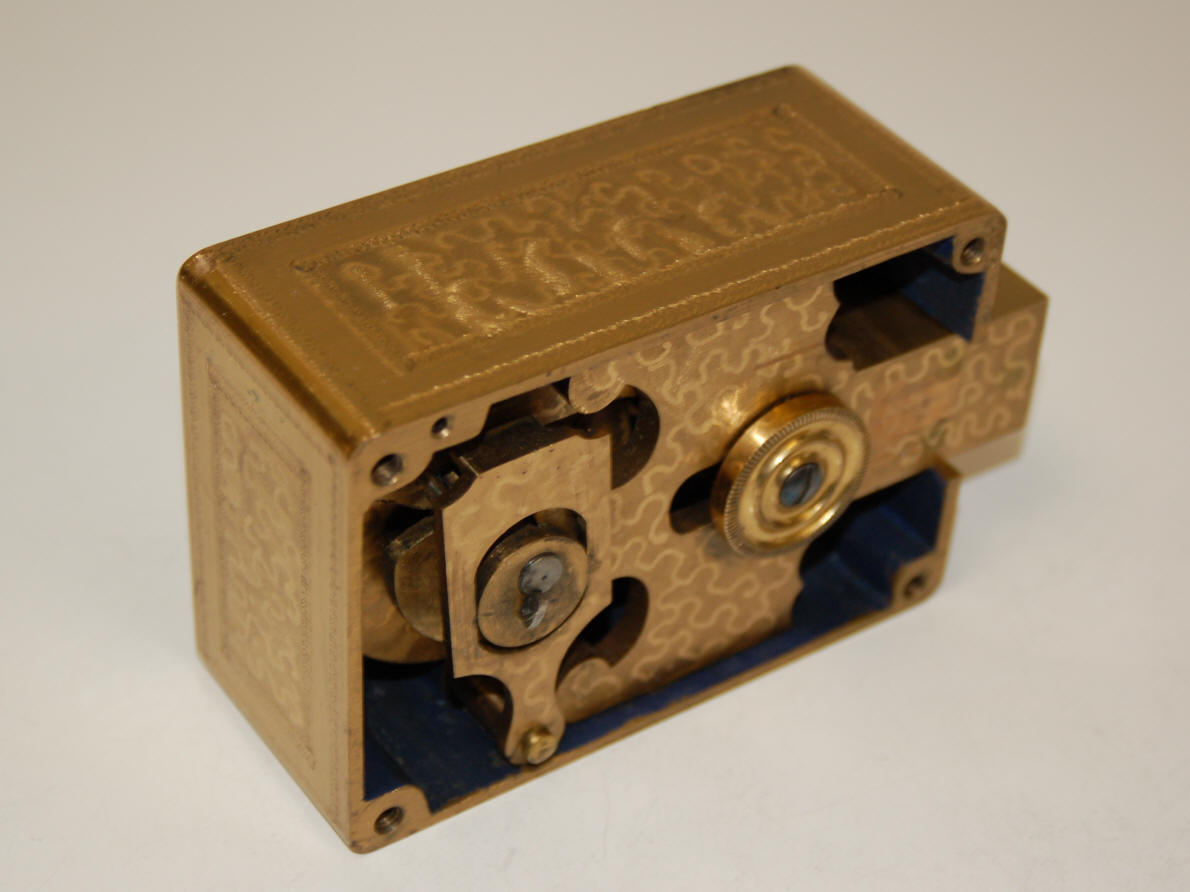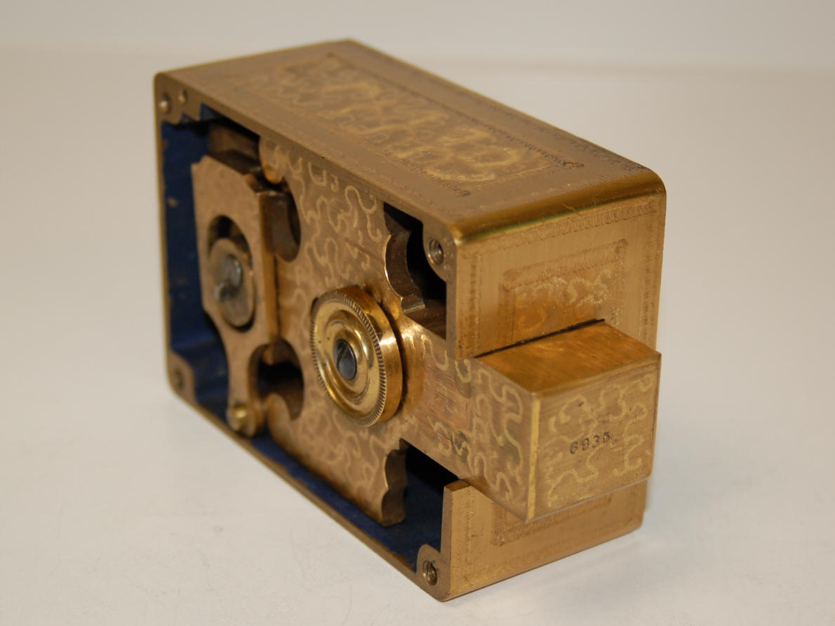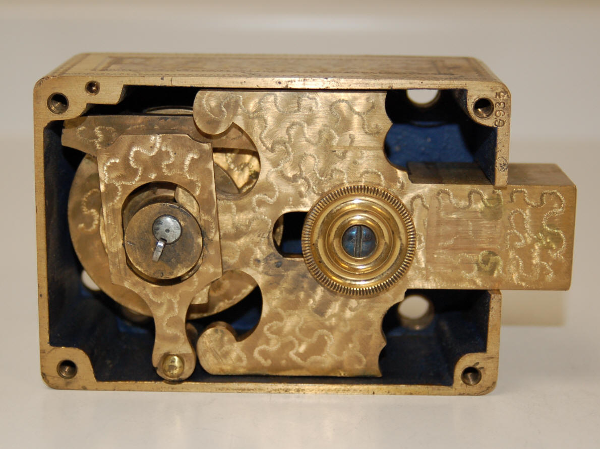 Sargent & Greenleaf, C. 1900. Four tumbler combination lock with special engraving on the case.