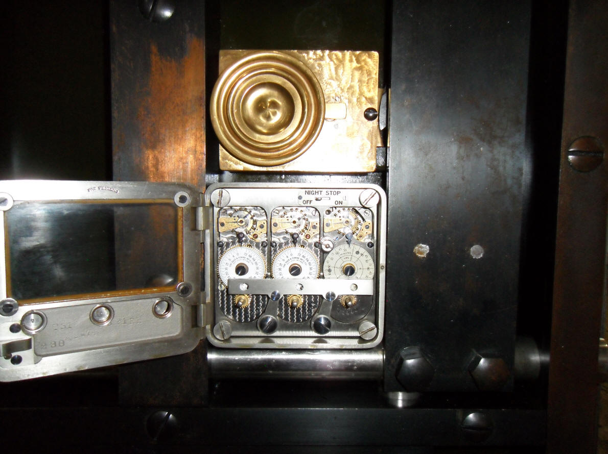 Notice the shape of the bolt dog in the photo above which closely matches the design in the patent drawing. A. Type T321 DAT (Delayed Action Timer) c. 1928. A rare dual purpose time lock based on a patent by Charles A. Miller as illustrated above. This timer contains two conventional Seth Thomas 72 hour Type T movements and one modified Type T movement that has a 7 hour duration. Type T movements were the smallest coffin style movements made for Yale. A day/night switch is provided to engage the 7 hour movement during the day time hours. This lock would fulfill two functions. The first to act as a normal overnight/weekend time lock; using the two 72 hour movements and the second to secure the vault for short period of times during the day, primarily in the event of a daytime burglary. The 7 hour timer could be set for intervals as short as 15 minutes and when the DAY STOP knob is set that movement is stopped via a light lever touching the balance wheel, therefore that movement is always in check for whatever amount of time has been dial in. In the event of a daytime robbery, the proprietor need only close the door, or more likely the door is closed, and then turns the bolt actuator to trip the third short-term movement; by doing so the bolt is dogged for the amount of time previously dialed into that movement. Obviously a daytime yegg (the term yegg is actually used in the patent description and is an outdated term, first seen in 1901 for a robber) will not be able to wait around for the time lock to run down. The NIGHT STOP switch is used to disable the third movement from being able to be activated preventing it from accidentally putting the time lock off guard in the middle of the night, and is switched off during the day to allow the DAY STOP feature to work. Obviously one can readily see a danger here. If one forgets to deactivate the DAY STOP by setting the NIGHT STOP it is possible to set the short term timer running and put the lock off guard in the middle of the night. To see another Yale with modified Type T movements click here. Below is a similar, but slightly later dated example. That lock lacks the additional "DAY STOP" knob where a drive gear is located and combines it into a single switch removing the problem of the lock being left off guard accidentally. Less than fifty of the first version were made, probably in recognition of this problem, with this being the only known three movement example. Case #242, movements consecutively numbered T2494, T2495, special timer movement T2445. 4 3/8" w x 4 1/8" h x 2 1/2" d. file 8 B. Type T321 DAT (Delayed Action Timer). c. 1933. Same functionality as example 'A' above; this example being one of three known so far. The difference between this model and the earlier one is the DAY STOP and NIGHT STOP functions are combined into one switch, eliminating the possibility of the short-term timer being actuated when the lock is meant to be on guard throughout the night. The timer contains two conventional Seth Thomas 72 hour Type T movements and one modified Type T movement that has a 7 hour duration. Type T movements were the smallest coffin style movements made for Yale. A day/night switch is provided to engage the 7 hour movement during the day time hours. This lock would fulfill two functions. The first to act as a normal overnight/weekend time lock and the second to secure the vault for short period of times during the day as described in example A. The 7 hour timer could be set for intervals as short as 15 minutes. To see another Yale with modified Type T movements click here. Below is a similar, but later dated example mounted into a safe door. Notice the Yale time lock advertisement on the door stating the safe is protected by a Yale time lock. There is also a photo of an identical model lock in the Harry Miller collection. Case #683, movements #T3307 , T3317, special timer movement #T3699. 4 3/8" w x 4 1/8" h x 2 1/2" d. file 257 The Mosler company also created a similar product in their Do-All®, Model D-A in 1938. There the time locks could be actuated for a selected period of 20, 40 or 60 minutes and used both of the regular 120 hour movements; making usage fool proof and eliminated the possibility of failure while a single movement was controlling the time lock as was the case in the Yale DAT series. Furthermore the short term actuation was accomplished by simply turning the combination dial. C. Type T321, c. 1907. This lock is equipped with Yale's smallest production movements the 'T'. Yale began to introduce its brass machine finished case to replace the earlier nickel plated damascened case around 1908. Yale began to order their T-movement in 1907, the low serial number on the case and movements makes this early in the production run. The lock was reputedly removed from the Honolulu Bank in Hawaii in 1941. See photo below for a similar lock mounted into a Diebold vault door. Case #109. Movements # T207, T475, T481. 4 3/8" w x 4 1/8" h x 2 3/4" d. file 146 D. Type T321, c. 1920's. Same as 'B' but a bit later version using the satin silver finish. Case #271, movements consecutively numbered T2988, T2989 and T2990. 4 3/8" w x 4 1/8" h x 2 3/4" d. file 86 E. Type T322, c. 1908. This is a wider case format of the triple gang time lock using T movements. Why Yale would use a larger case when everything was otherwise the same as their smaller version depicted in example 'B' is unknown. Probably there was an application where the height was critical since this case is 7/8" less in height than examples A through D. This also necessitated the design of the very low profile snubber bar seen on the bottom of the case as opposed to the more conventional design over the front of the time lock dials. It also required the addition of the blued metal trip lever 'tail pieces' to connect to that snubber bar rather than being driven by a pin on the time lock's indicator dial which was Yale's standard design. Notice in the third photo how Yale 