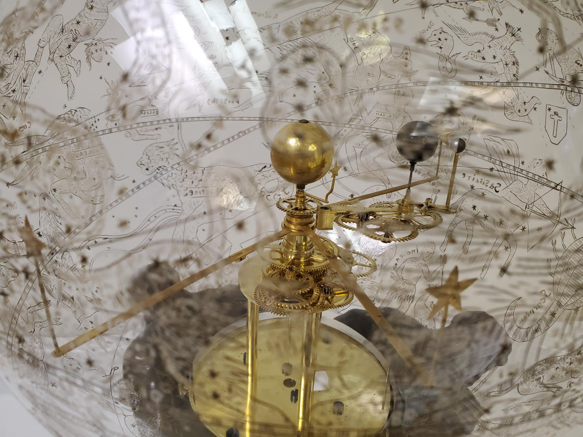 Unknown, Paris, France, 1786. Single train 14 day duration, tic-tac, one-half second pendulum. Movement with front gilt plate surrounded by three bronze figures of Atlas holding a glass celestial sphere; within the sphere a clockwork-driven orrery with plants to Saturn including working Earth-Moon system.