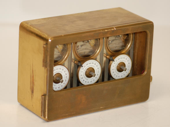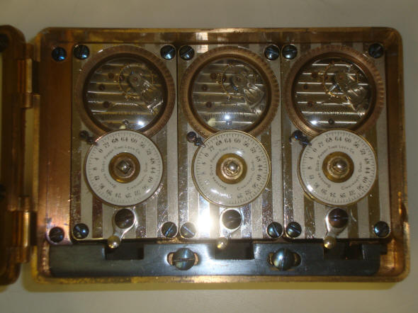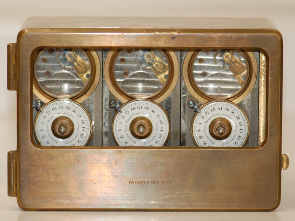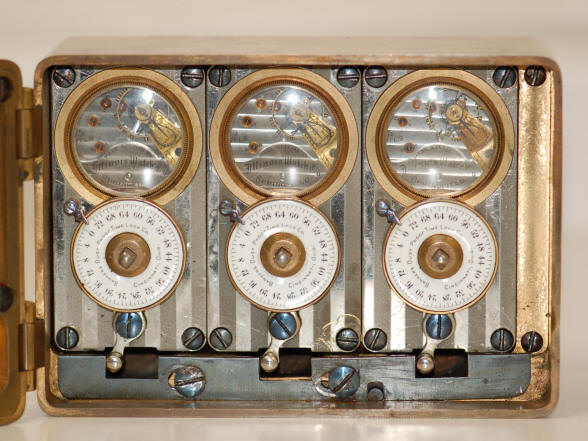 B. c. 1906. Identical model to that depicted in 'A', except with a spotted, gold finish which was sometimes used in Remington Sherman vaults. The damascene spotting was only on the door with the sides of the case in a plain finish. This color was far less common than the silver design and was probably produced for use in a Remington and Sherman Co. vault door as this was their distinctive design. Case #3082, movements #1974296, #1974297, #1974300. The serial numbers are virtually consecutive making this one of the few Banker's time locks with this feature. Most likely this was a specification asked for by Remington as they were a premium maker. Its curious that these movements have earlier serial numbers compared to others, but the case is of a later number than any other. So does one use the case number or the movement numbers as a guide? It could be that there was a different numbering system for this style of case. Its unlikely that someone had three consecutively numbered movements to drop into a later case. file 165