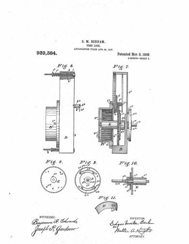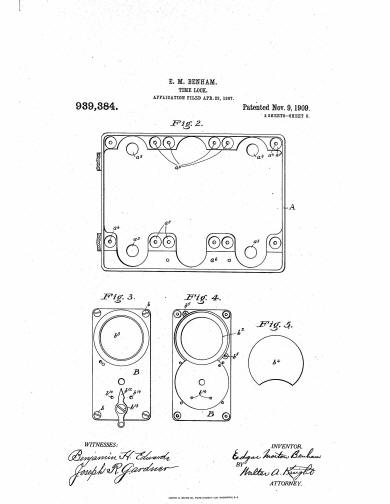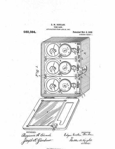 Patent drawings from #939,384 November 9, 1909 by Edgar Morton Benham. The patent was filed in 1907 but languished in red tape for over two years, possibly because it was openly admitted that it was a patent for the same outcome from "a less number of parts and simplified arrangement." If Victor really bought out the Consolidated company which had so many important patents of its own, one has to wonder why Bankers Dustproof would sink two years effort into securing such a dubious one. (1) (1) American Genius Nineteenth Century Bank Locks and Time Locks, David Erroll & John Erroll, pp 314 |