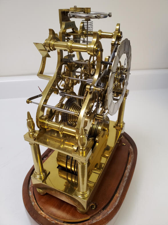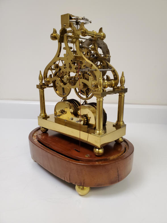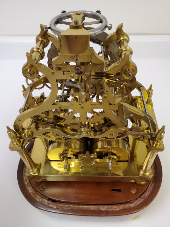 snail system. bell located in wooden base. Jeweled lever escapement. Movement is 10" h x 7" w.