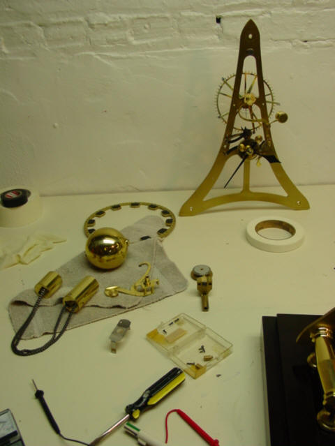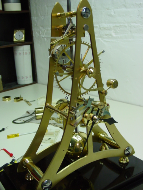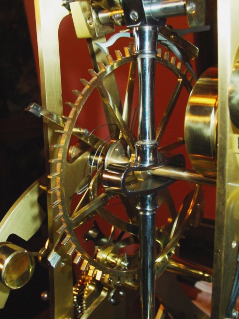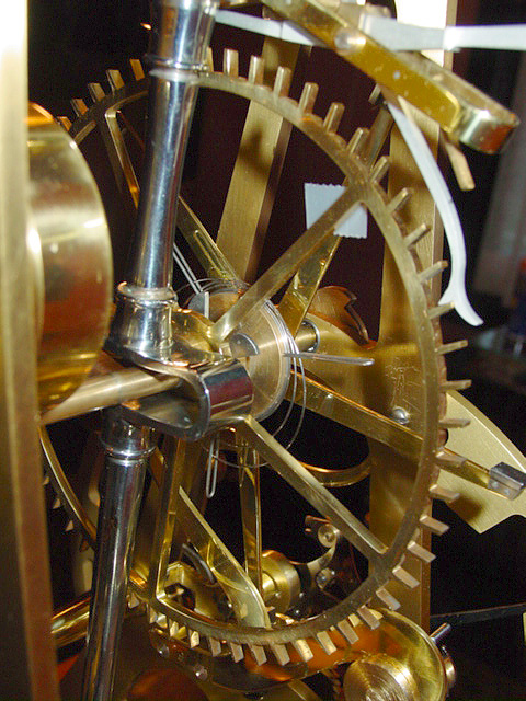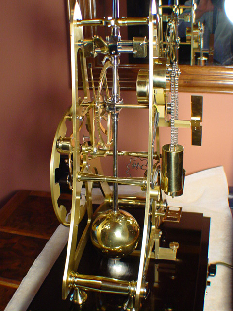 First two photos show a view of the endless chain train remontoire. Note fly fan air brake. Third and fourth photo show a view of escapement wheel spring remontoire grasshopper escapement from both sides.
