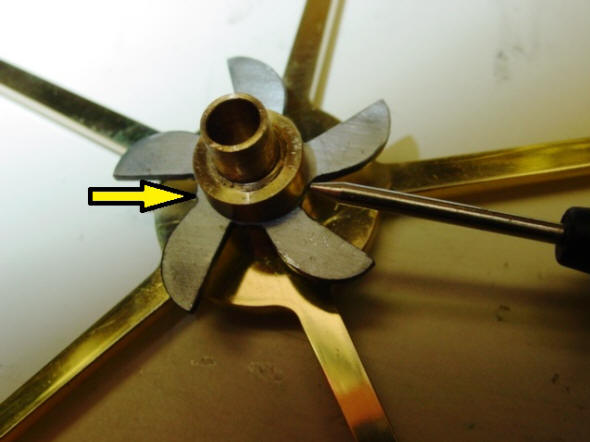 The remontoire daisy cam was not properly cut as received. This would cause the remontoire to be unreliable and ultimately the clock to stop. The first photo shows where the imperfections were. The arrow on the left shows where a nub was left where a a smooth valley should have been. The right side as indicated by the screwdriver tip shows another misshapen area where the curvature was not deep enough for the remontoire to reliably be released when the detent entered this part of the daisy cam recess. Next photo shows the reworked daisy cam.