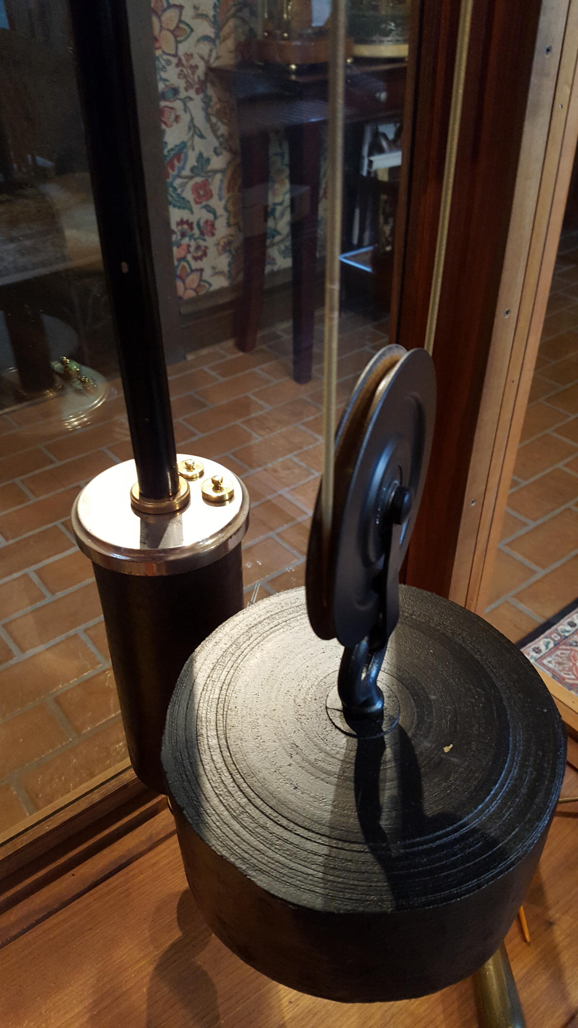 Maker, E.J Dent, London, England. Model - Special exhibition/presentation piece, c. 1850's.   Six - legged gravity escapement with 15 second Bernard-Henri Wagner train remontoire. One second compensated pendulum. Harrison style maintaining power. Solid cast brass plate -and -spacer type frame, 22'H x 17"w x 12"d. Thickness of main plates 7/16". Overall height 6' 6". Click here for a video and audio of this type of remontoire.