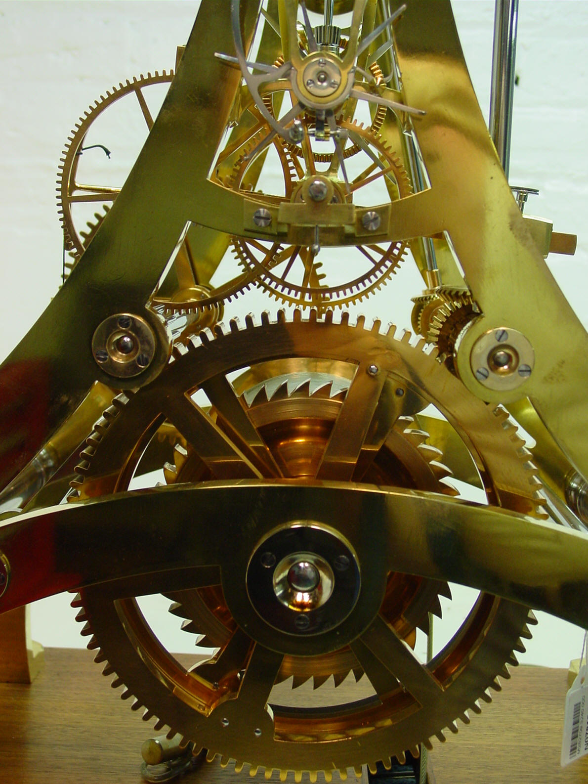 Maker, E.J Dent, London, England. Model - Special exhibition/presentation piece, c. 1850's.   Six - legged gravity escapement with 15 second Bernard-Henri Wagner train remontoire. One second compensated pendulum. Harrison style maintaining power. Solid cast brass plate -and -spacer type frame, 22'H x 17"w x 12"d. Thickness of main plates 7/16". Overall height 6' 6". Click here for a video and audio of this type of remontoire.