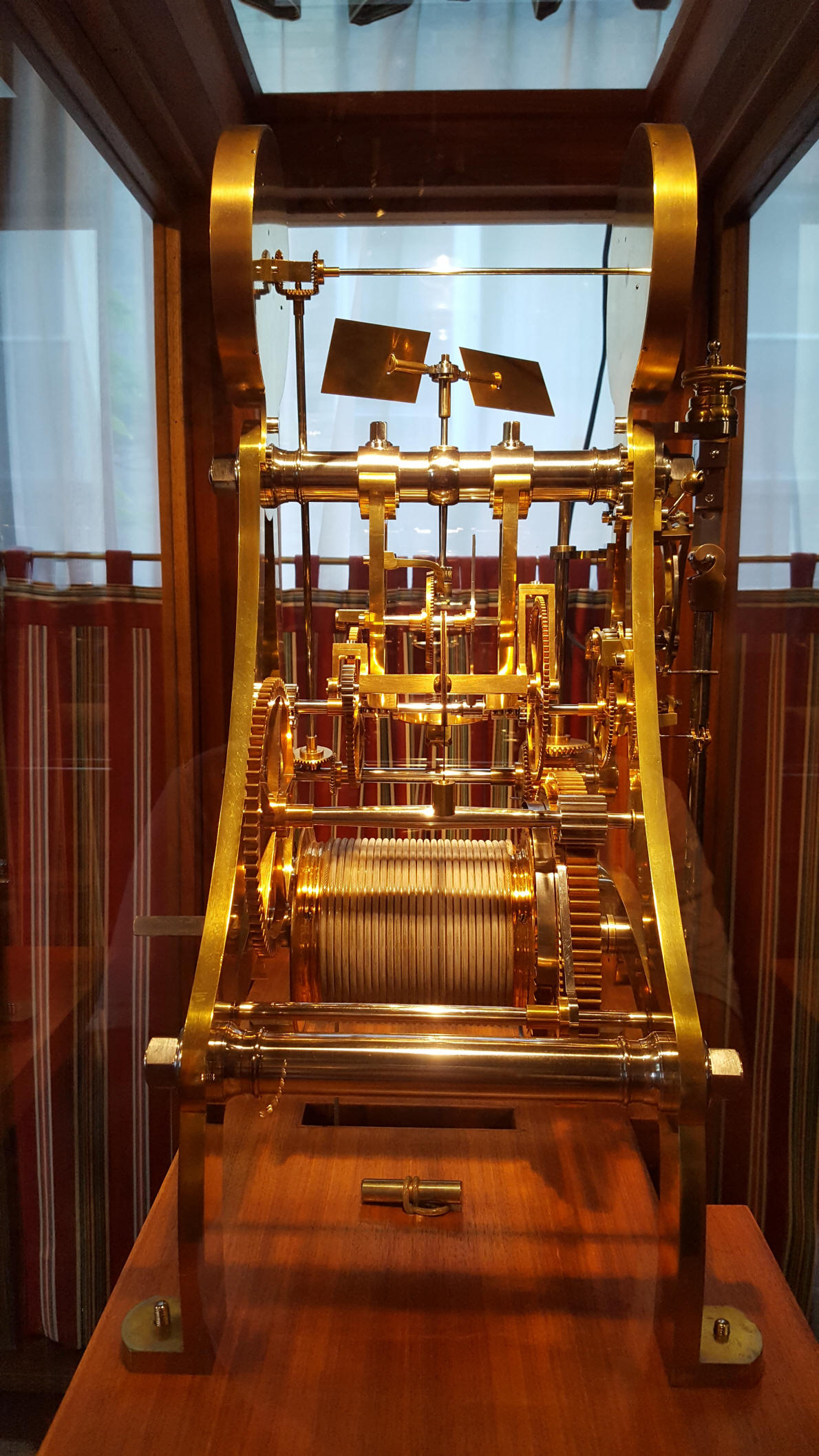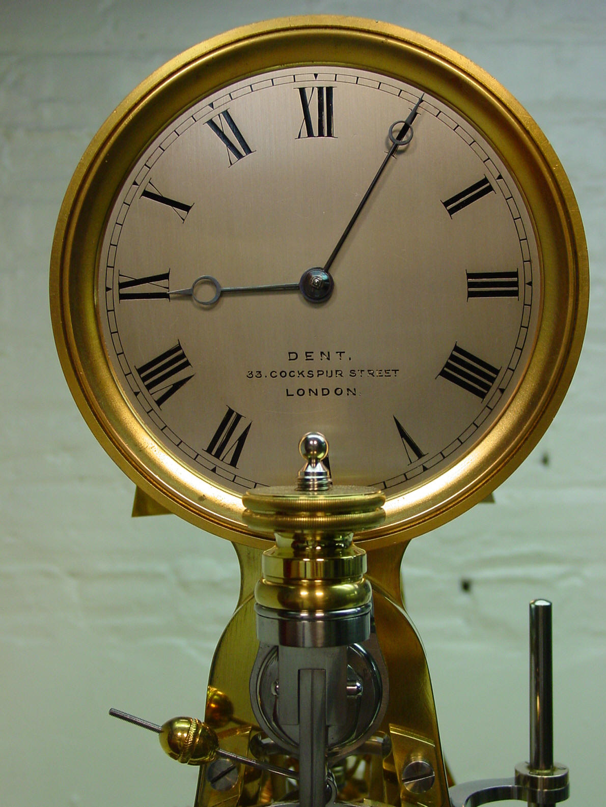 Maker, E.J Dent, London, England. Model - Special exhibition/presentation piece, c. 1850's.   Six - legged gravity escapement with 15 second Bernard-Henri Wagner train remontoire. One second compensated pendulum. Harrison style maintaining power. Solid cast brass plate -and -spacer type frame, 22'H x 17"w x 12"d. Thickness of main plates 7/16". Overall height 6' 6". Click here for a video and audio of this type of remontoire.