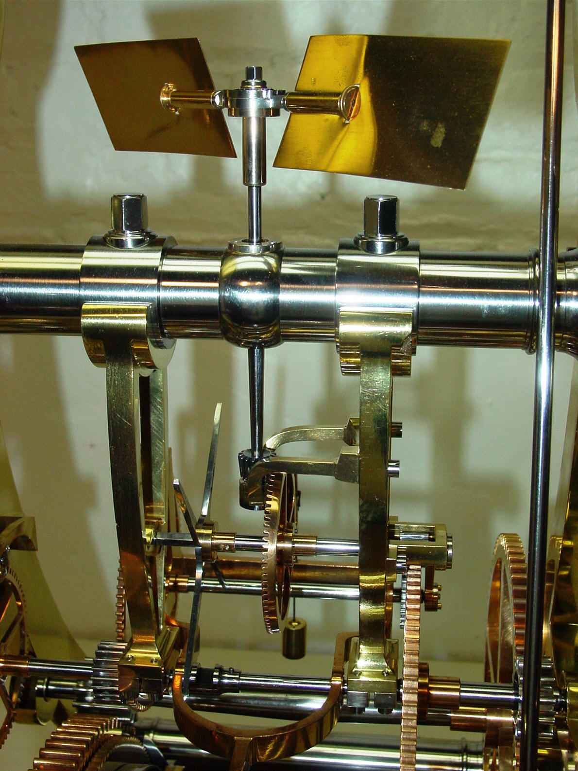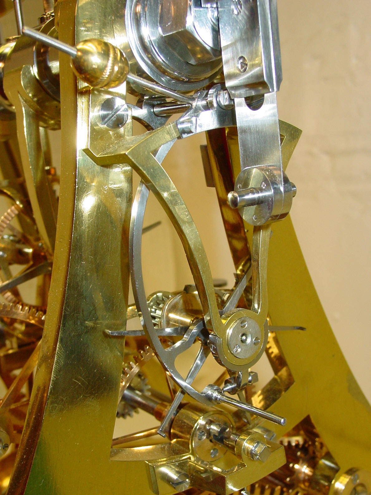 Maker, E.J Dent, London, England. Model - Special exhibition/presentation piece, c. 1850's.   Six - legged gravity escapement with 15 second Bernard-Henri Wagner train remontoire. One second compensated pendulum. Harrison style maintaining power. Solid cast brass plate -and -spacer type frame, 22'H x 17"w x 12"d. Thickness of main plates 7/16". Overall height 6' 6". Click here for a video and audio of this type of remontoire.