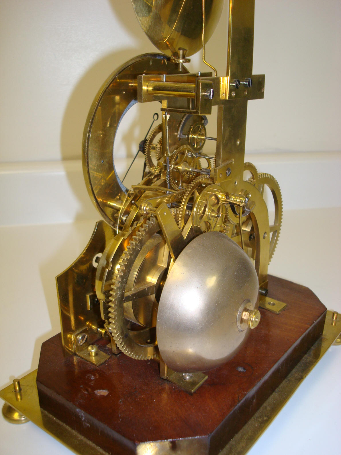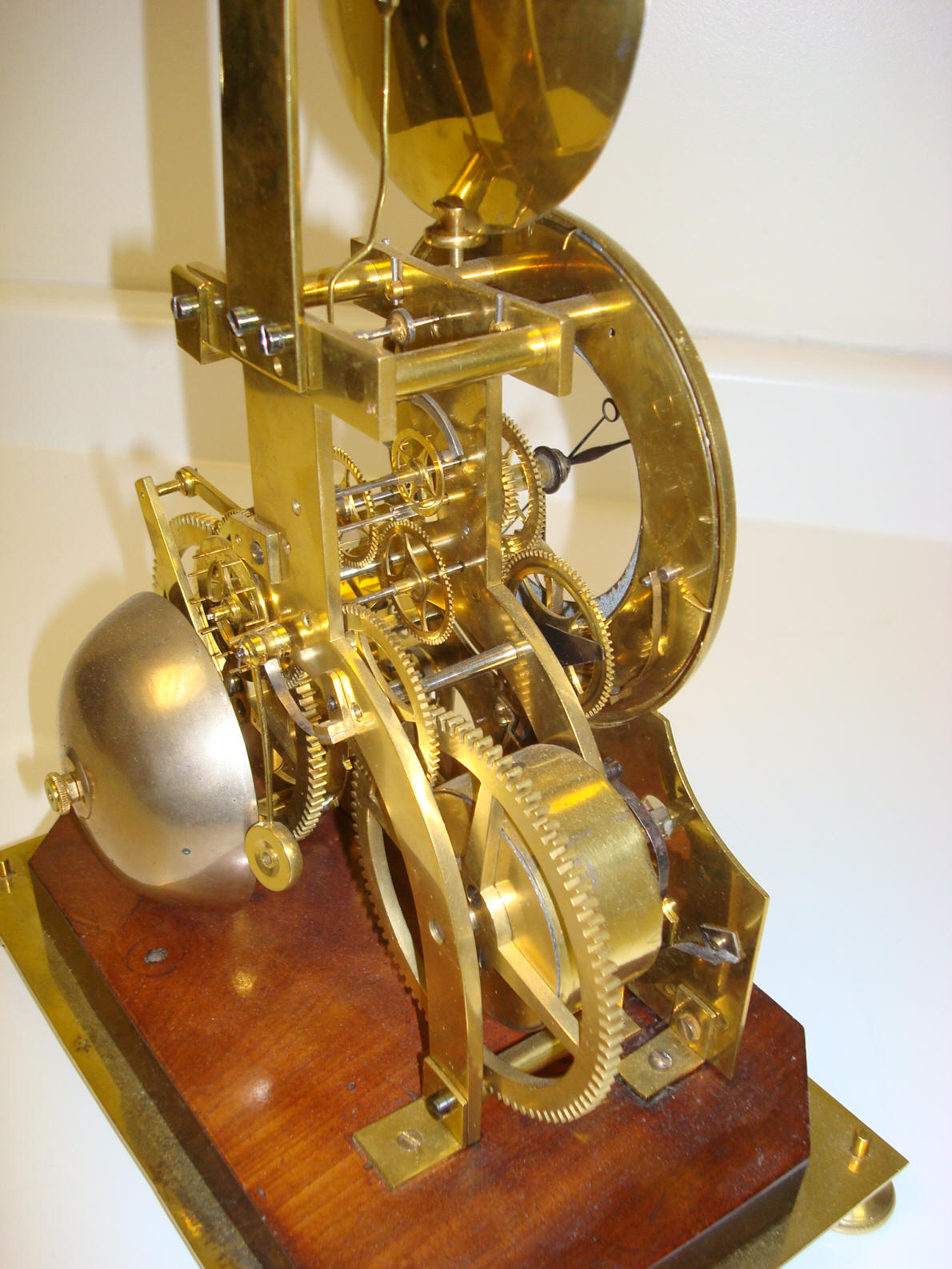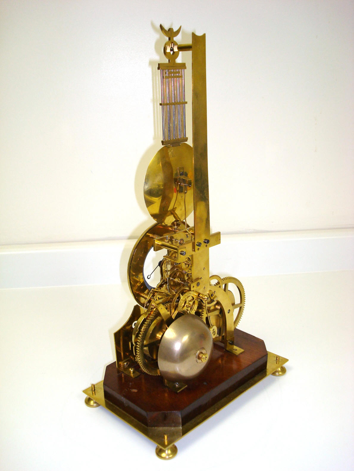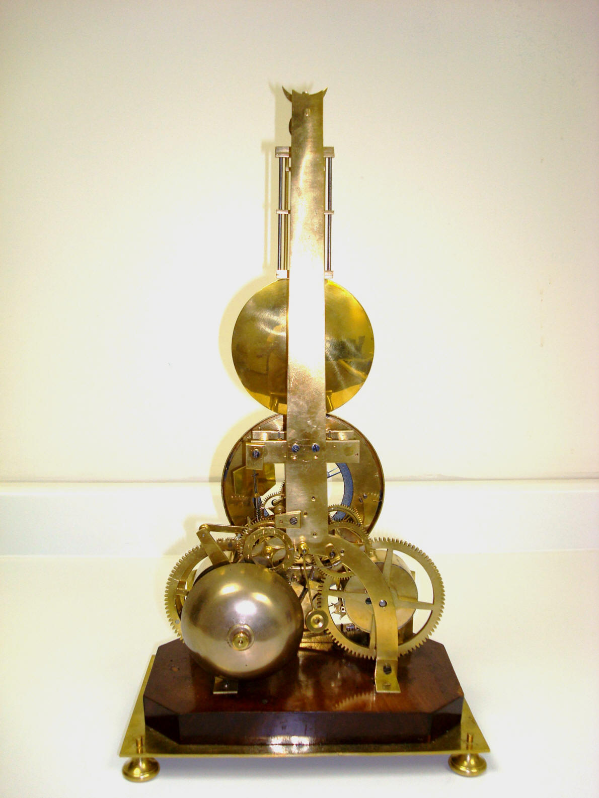 Ducret, Besoncon, France, c. 1810, One-quarter second nine rod grid-iron pendulum on knife-edge mounted above movement, pinwheel escapement, countwheel strike. 17"h x 8.5"w x 5"d.