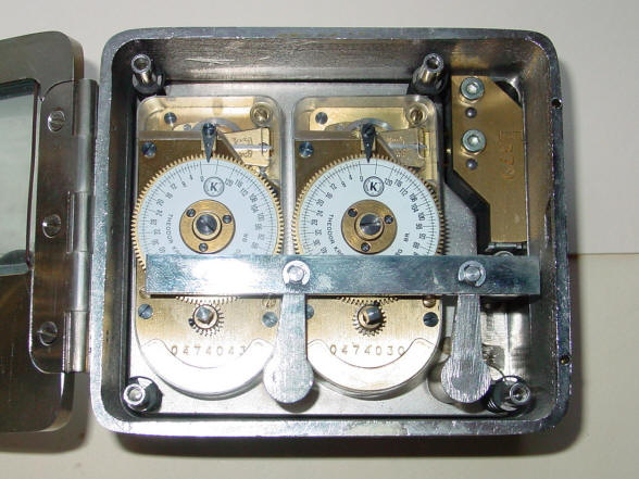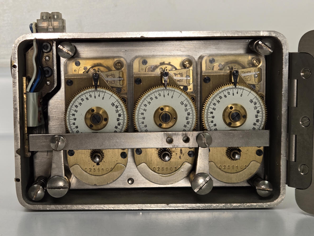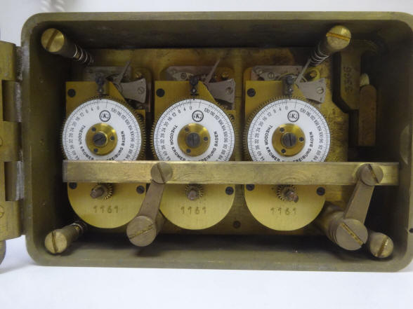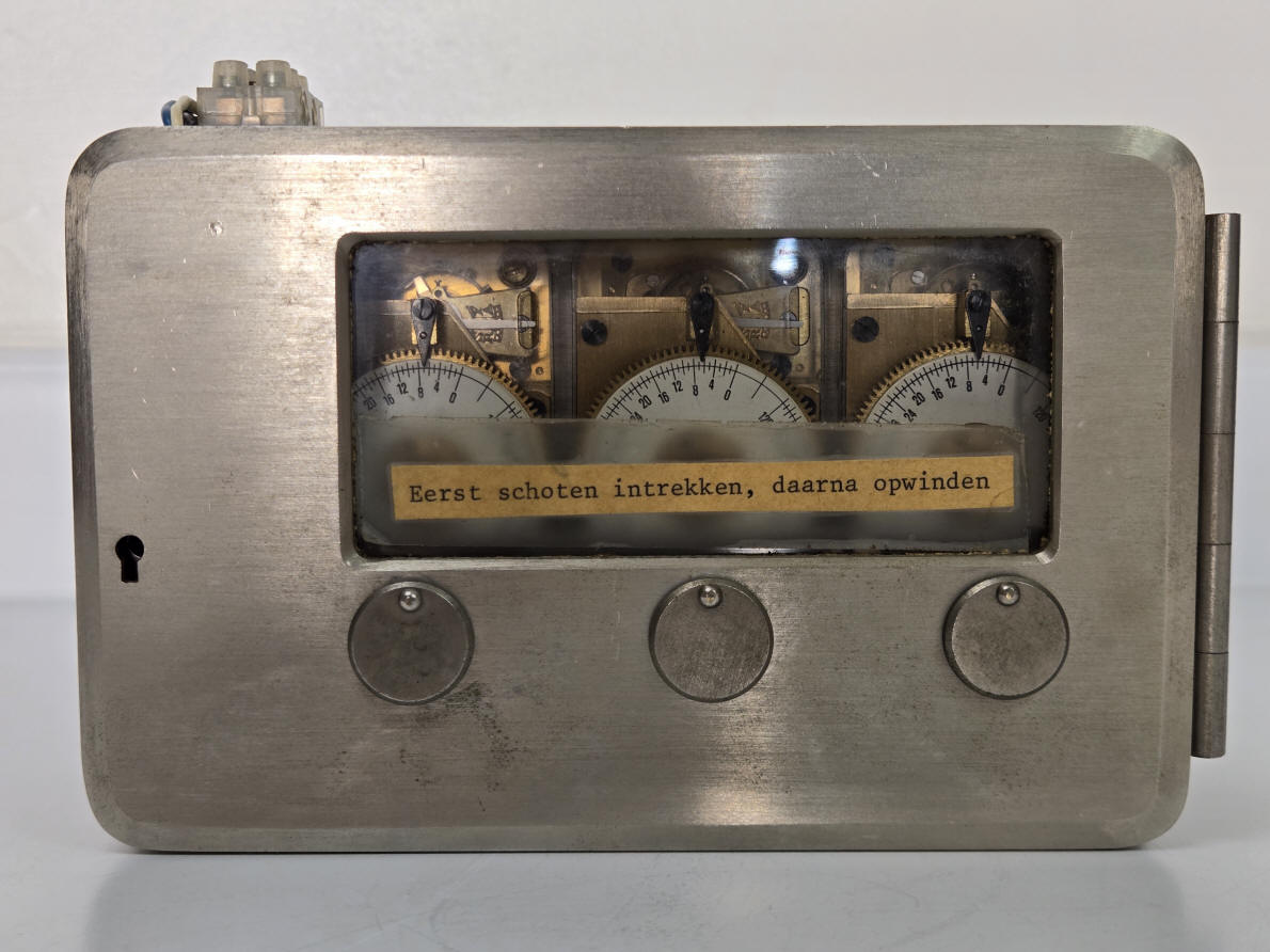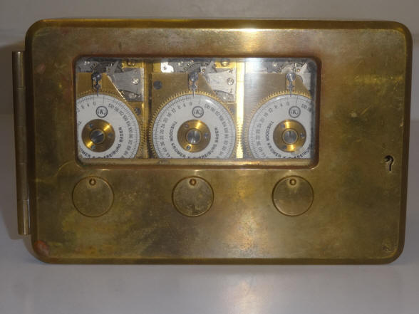 A. A Kromer from the 1950's. Meant as a direct drop in replacement for the Yale model K22. file 26 B. A three movement Kromer from the 1950-1960 period in a case style and internal dog bolt mechanism very similar to the Yale Triple K. The height and width dimensions are identical but it is considerably less deep at 2.5" vs. 3.13" than the Yale due to the fact that Yale uses a much thicker and heavier anti-dynamite movement containment plate. This plate is supported by four springs from the rear of the plate as well as the front and these are secured by the four bolts seen in the corners of the time lock box in the second photo. The Yale also has a door hinge milled from the solid case shell as well as the door plate and pinned together, while the Kromer uses a butt hinge countersunk into the door and surface mounted to the case and held with screws very much like a conventional door hinge. The mounting holes are different from the Yale, so it was not meant to be a "drop in" replacement for a Yale. It is overall less robust and of cheaper construction and presentation than the Yale counterpart. Note that all of the movements are stamped with the same number, so these are probably a model rather than a serial number. Case #3366, all movements #1161, 6.25"w x 4.25"w x 2.5"d. file 180 C. A Kromer from the 1950-1960 period same as that described in example 'A' but with a silver case finish and equipped with an electric sensor to act as a tell-tale to let personnel know if the bolt dog was open or closed while the safe was closed. Movements have no identification and are of a different style than those in example 'A', but do share the exact same mounting screw positions for the movement plate. Each movement is encased in a clear plastic dust-proof enclosure, the first time I've seen this and a clever idea. The typed label on the window aperture is in Dutch and reads, "First retrieve bolts, thereafter winding up" This is a deaccession from the LIPS Collection, Netherlands. Case #876, movements #01269031, #0269105 #0269106. file 367 D. Star Safe Manufacturing Co, Paramount, California with Kromer movements, c. 1960. This is a Kromer lock licensed to the Star Safe company. This model has a special analog sector dial attachment labeled "Short Time Indicator" that shows the final four hours, see video. I have seen a few other of this model and none has this attachment. file 19 Below is a Kromer time lock in a Mosler safe door. It does not have the optional short term indicator. |