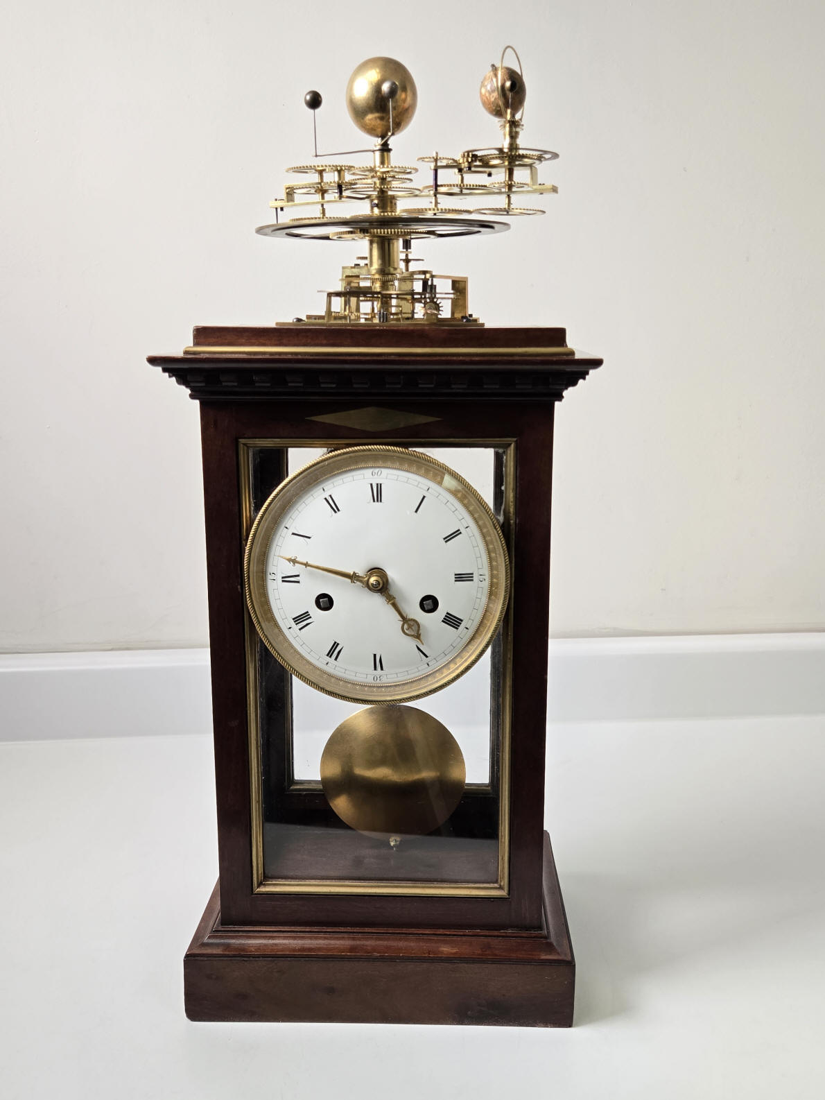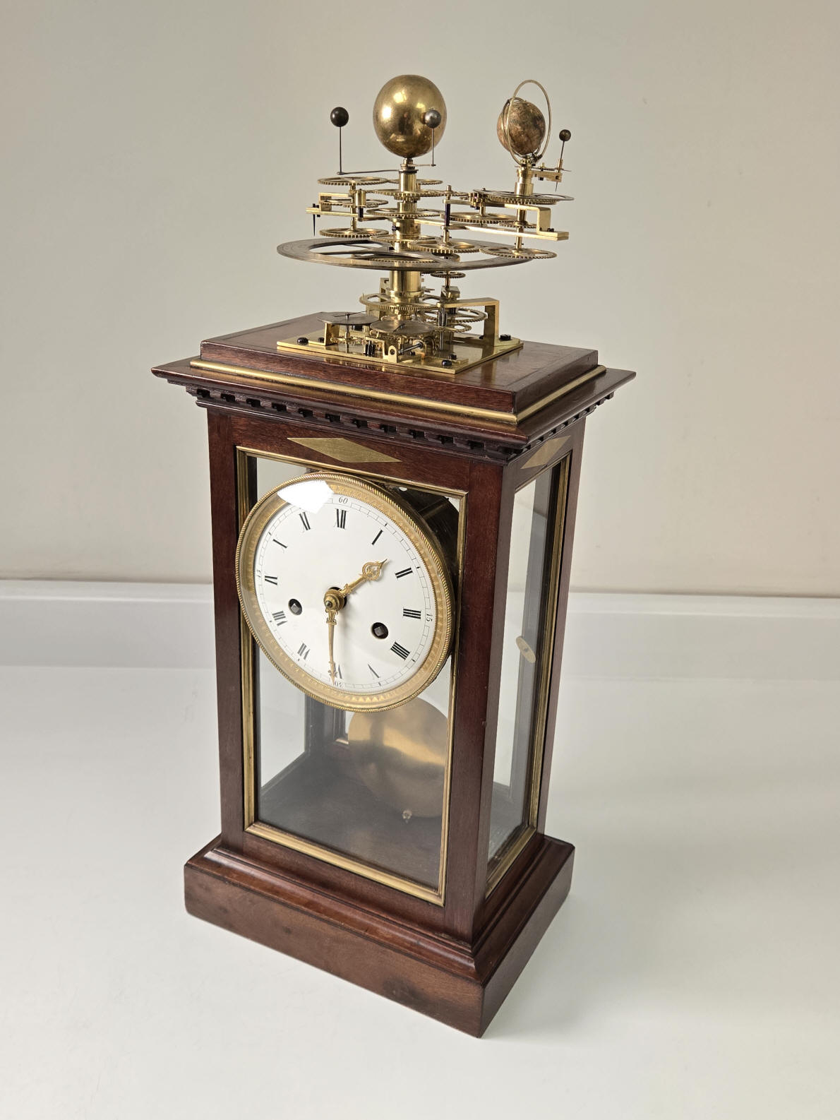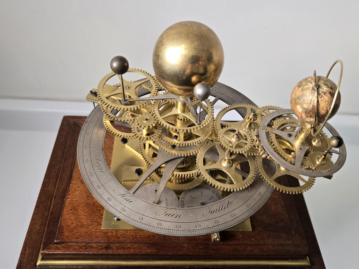 hour strike on count wheel. An orrery is mounted to the top of the clock