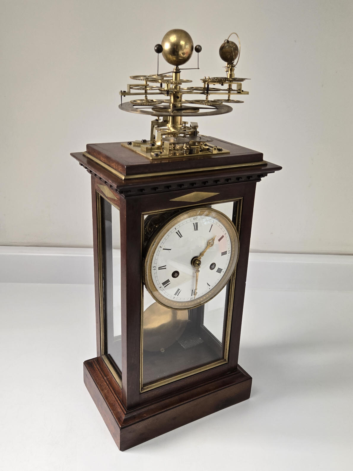 hour strike on count wheel. An orrery is mounted to the top of the clock
