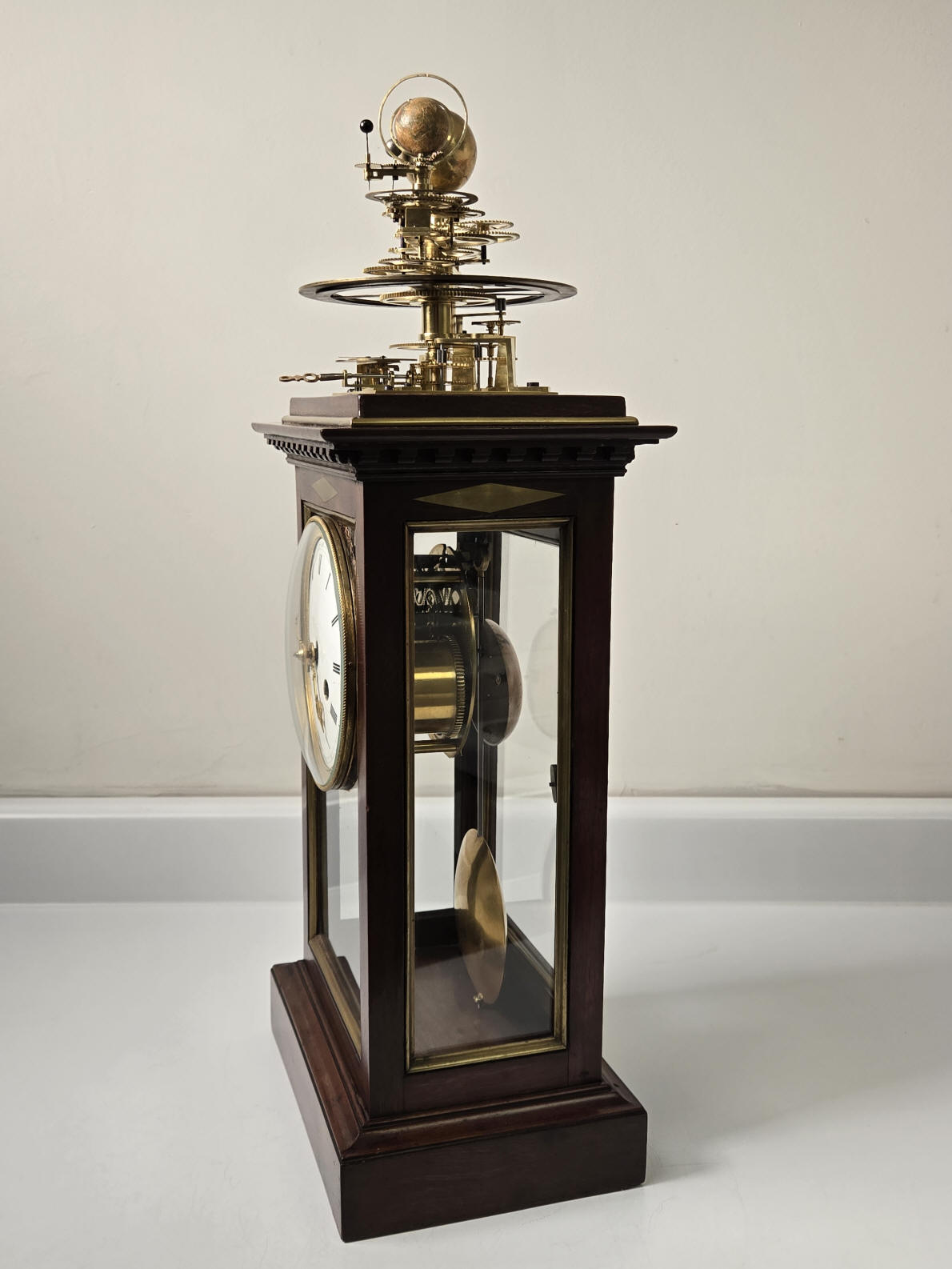 hour strike on count wheel. An orrery is mounted to the top of the clock