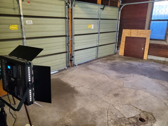 In the first photo the garage is cleared and LED klieg lights are placed for