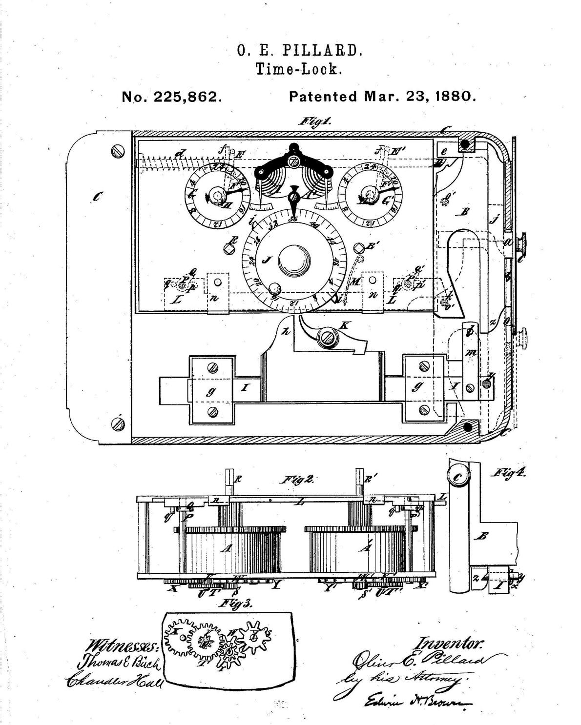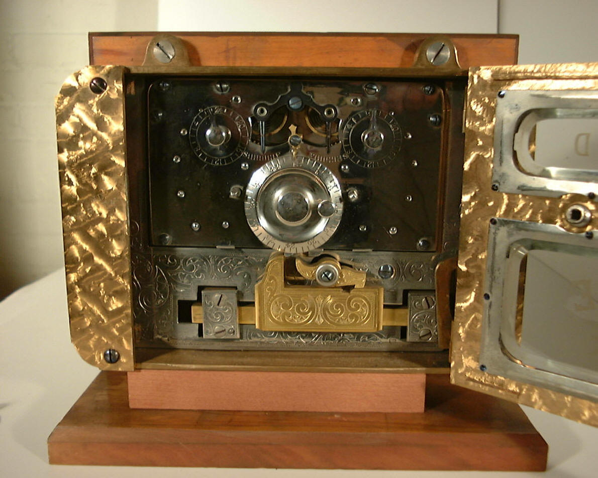 Pillard model #2, c. 1875. New Britain Bank Lock introduced their Oliver Pillard-designed time lock in 1875, the model #1. Based on two forty-eight hour
