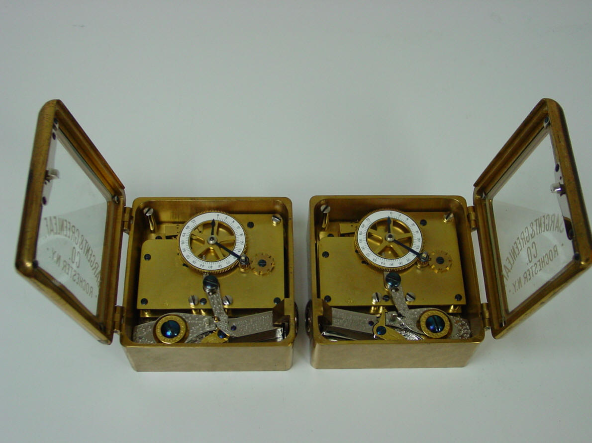 A. Model #4 - Corliss. The locks pictured were shipped September 8, 1900 according to an original S&G logbook, see below. This model was used (in pairs) exclusively in Corliss 'Cannonball' Spherical style safes. Note original etched glass which often is missing due to breakage. Sargent and Greenleaf invented the first commercially produced practical time lock and made their own movements. Most other firms, notably Consolidated, Yale, and Diebold used movements from outside suppliers mainly E. Howard & Co. Around 1902 Howard exited the time lock business when it was purchased by the Keystone watch company and Seth Thomas filled much of this business. Other time lock makers who arrived later, as Mosler Safe Co., and then Bankers Dustproof, used American Waltham Watch and Illinois Watch Company pocket watch movements. Beginning around the 1950's movement production shifted from the United States to Switzerland. Sargent and Greenleaf ceased production of their own movements due to high domestic costs in 1953. This lock has the company's jeweled (damascene) bronze case. They had two types of damascene patterns, a spotted and a more random 'crystalline' pattern. This having the latter. 4 1/2"h x 4 1/2"w x 2 3/8"d. Case and bolt 1541-2 (left), 1541-1 (right); movements 1563-2 (left), 1563-1 (right). file 110