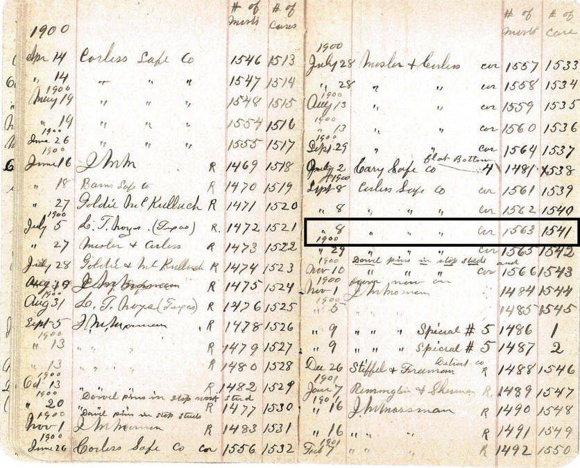 Entry for the time lock above from S&G logbook showing case #1541 and movement #1563 and sold to the Corliss Safe Co. Notice on the cover of the logbook that Corliss is misspelled as "Carlese" or maybe "Corlese".