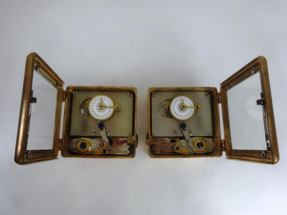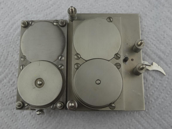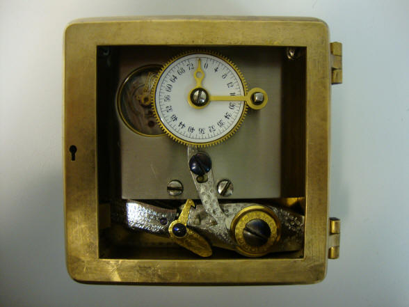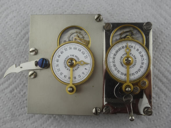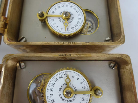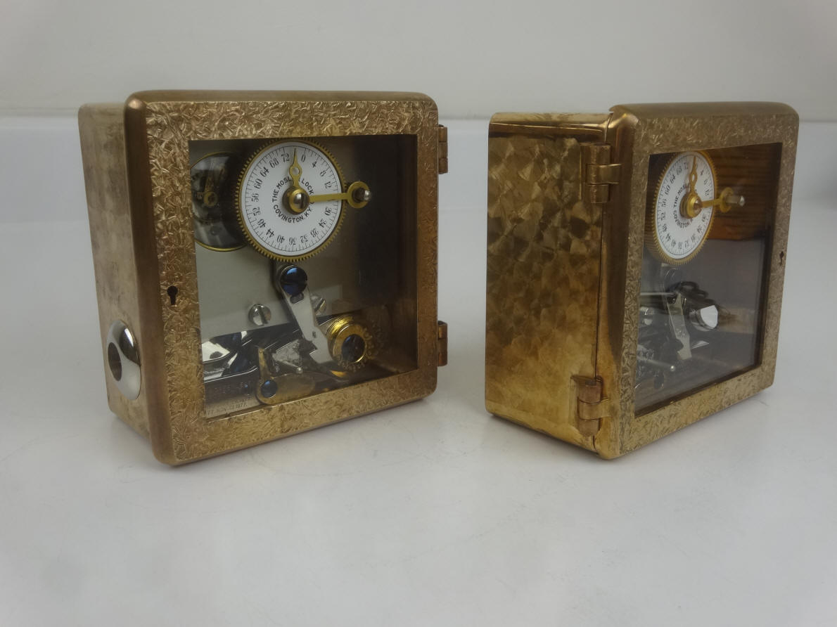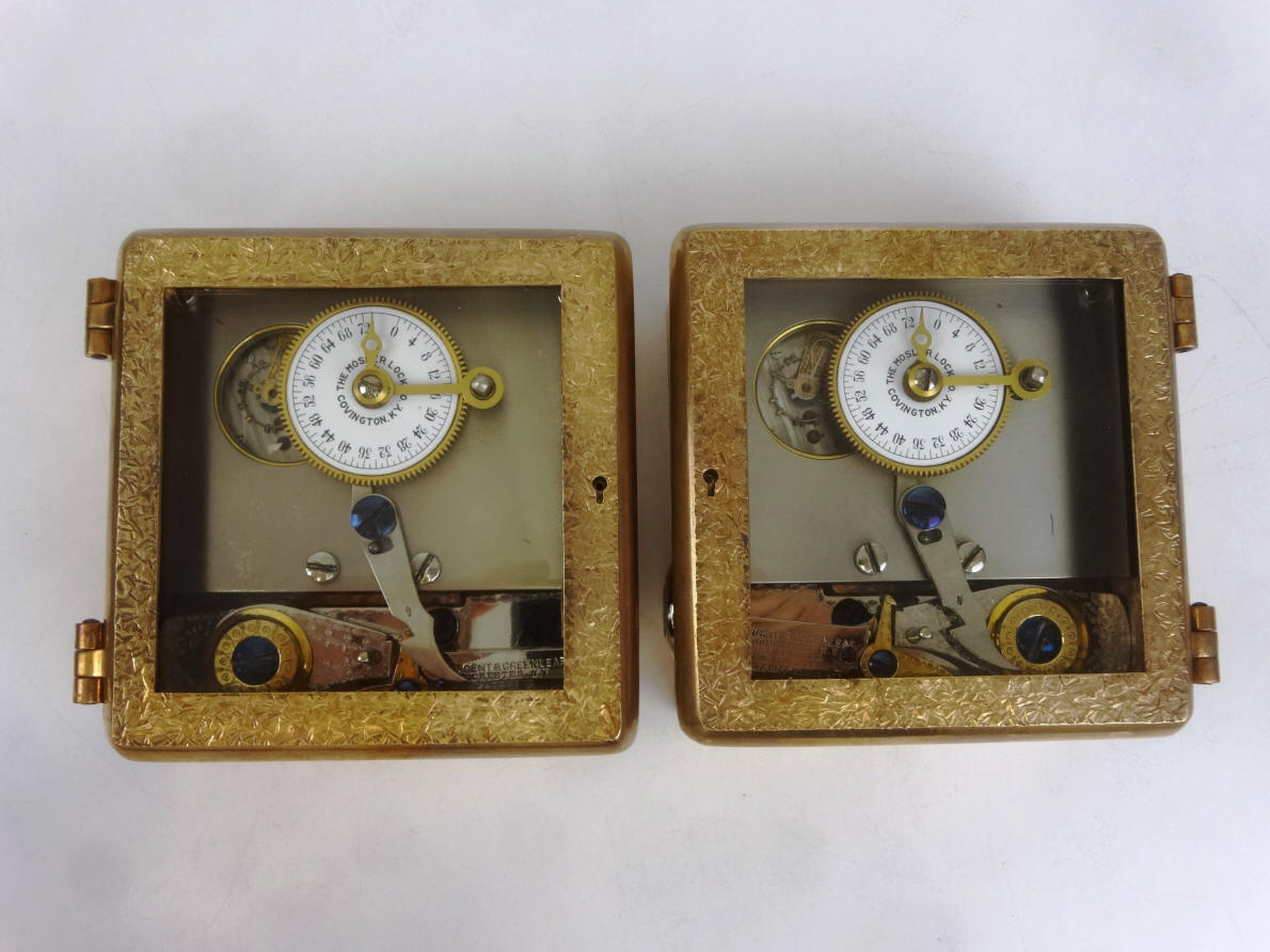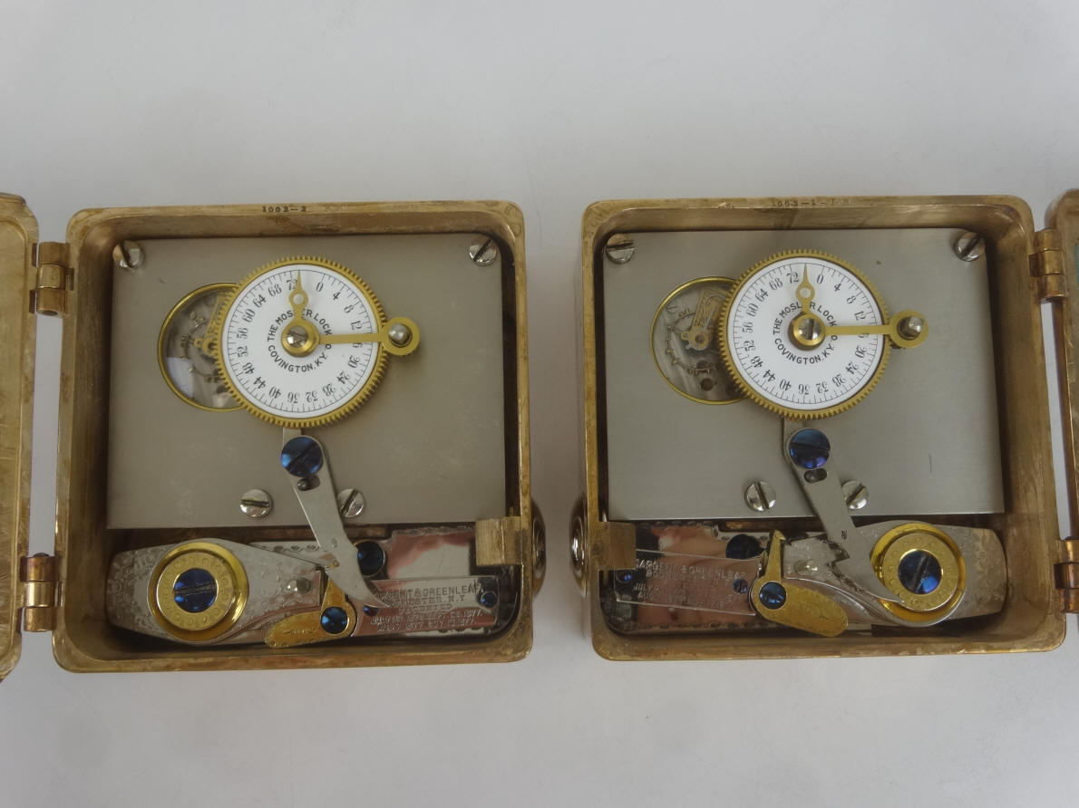 These photos show side by side comparisons of the movement employed by Mosler for this modification as well as a production Mosler movement. Notice in the second photo that the modification movement has no mounting holes drilled into the three corners (one corner has been completely milled away). This, as well as the door finish, precludes the possibility that the modification was done by an aftermarket third party since the production Mosler movements would have had the corner holes before leaving the factory. After market conversions were sometimes done with the S&G single plate movements used in the company's models 2, 3 and 4. Aftermarket examples by Andy Kotas. B. Model #4 - Corliss. The locks pictured were the third set made and would have been produced in December 1888. This model was used (in pairs) exclusively in Corliss 'Cannonball' Spherical style safes. This set had the original S&G movement set replaced by the Mosler Safe Company. The replacement movement is a Mosler using an Illinois Watch Co. #18-size Model #4 watch movement. Mosler entered the time lock business in 1916 and their crackle finish applied to the doors dates this conversion to 1916. The Illinois movement was the first of three movement models used by Mosler throughout its time lock production ending in 1967. 4 1/2"h x 4 1/2"w x 2 3/8"d. Case and bolt 1541-2 (left), 1541-1 (right); movements 1002-1 (left), 1002-2 (right). file 261 Sargent and Greenleaf invented the first commercially produced practical time lock and made their own movements. Most other firms, notably Consolidated, Yale, and Diebold used movements from outside suppliers mainly E. Howard & Co. Around 1902 Howard exited the time lock business when it was purchased by the Keystone watch company and Seth Thomas filled much of this business. Other time lock makers who arrived later, as Mosler Safe Co., and then Bankers Dustproof, used American Waltham Watch and Illinois Watch Company pocket watch movements. Beginning around the 1950's movement production shifted from the United States to Switzerland. Sargent and Greenleaf ceased production of their own movements due to high domestic costs in 1953.