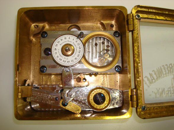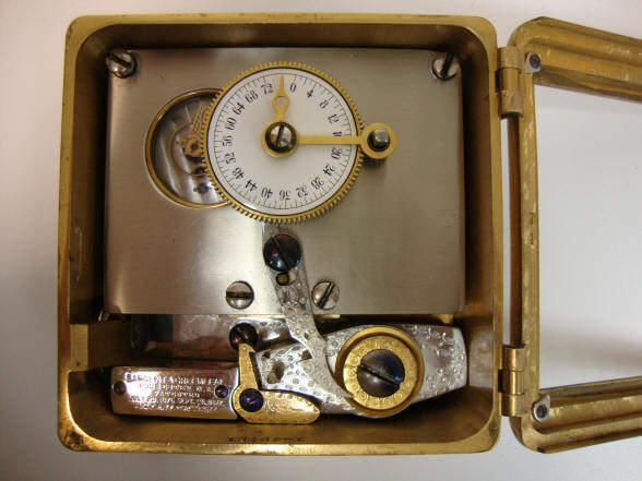 After Mosler acquired Corliss they continued to service the S&G #4 time locks with S&G movements until Mosler acquired the Banker's Dustproof Time Lock Co. in 1915. This marked Mosler's entry into the time lock business. Mosler experienced some difficulty in their first year of starting up the business, enlisting Yale to provide time lock movements for their first branded time locks in 1916. In the example above, the original S&G time lock movement must have needed service just at the time Mosler bought Corliss and Mosler used the existing Banker's time lock inventory for this movement replacement. It certainly would have been easier and produced a more reliable lock to have replace it with a O.E.M. from S&G. But it appears that Mosler wanted to put its stamp on the time lock. If this is so, it's interesting that they did not remove the S&G logo glass. Another alternative explanation is that S&G, unlike Yale, may have refused to provide movements to Mosler, a new competitor, hoping that these modifications may result in a lockout, thus damaging Mosler's reputation in their fledgling time lock business. A. Model #4 - Corliss. It was done sometime after 1916. The substituted movement is a fairly rare Banker's Dustproof Time Lock Co. product and this company was only in existence for a brief nine year period between 1906 and 1916. Mosler bought Bankers Dustproof around 1916 and entered the time lock business that year. Mosler's early time locks had movements that resembled Banker's Dustproof and so this conversion was probably done right after that acquisition. Mosler had acquired Corliss in the later 1895 and so probably did this conversion as well. This is in contrast to other S&G conversions done by private contractor. The case on this example is in the best condition I'd ever seen, fully pristine deep gold plating and superb crystalline damascene (jeweled) pattern. More on this and other modified time locks. file 83