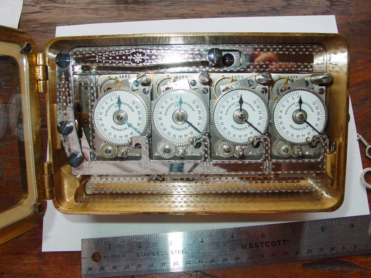 B. Model P. Same as above now in regular production. Snubber bar has slightly different configuration from the earlier prototype above. This example about 1920 and uses S&G's 'H' size movements. 7 7/8"w x 4 3/4"h x 3"d. Case #P-164. Movements #4106, 4188, 4189, 4339. file 118 |