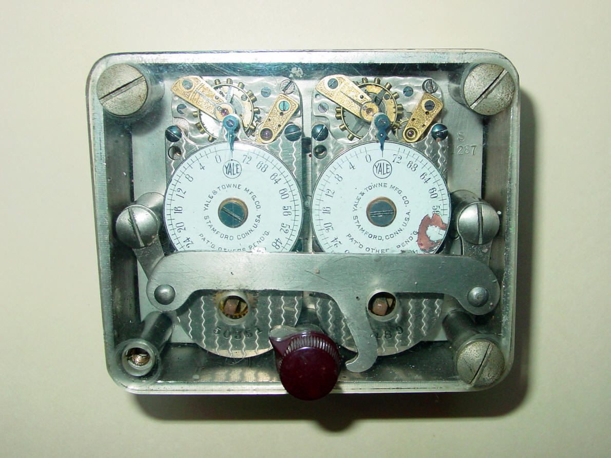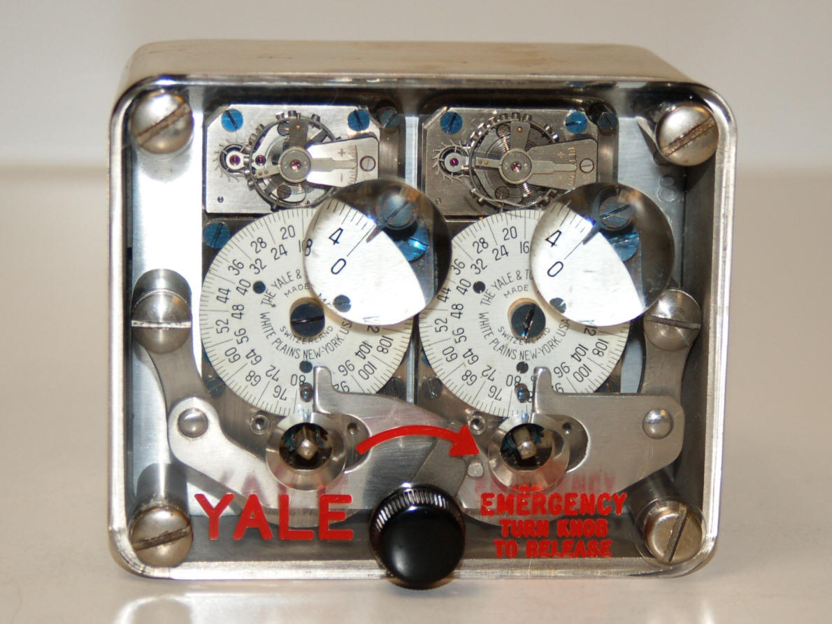 time lock made by Yale using their 'L' sized movements. 4.25"w x 3.5"h x