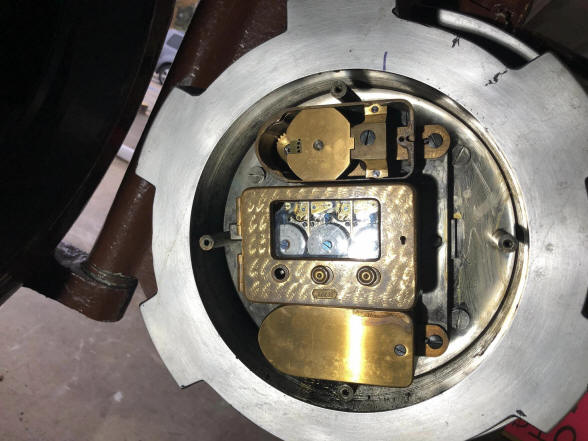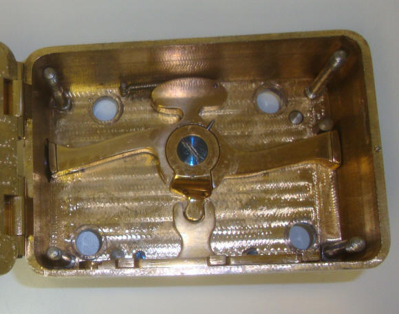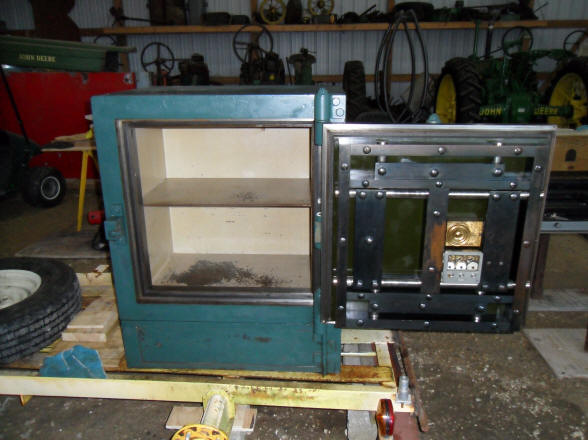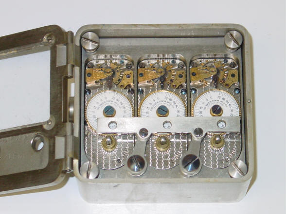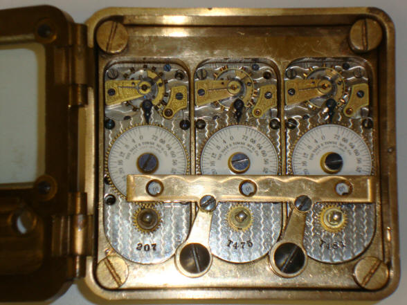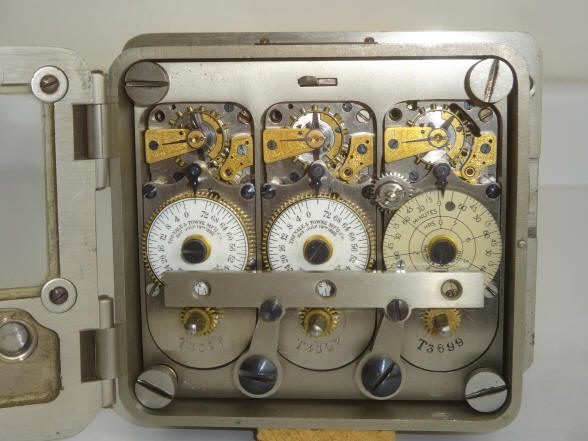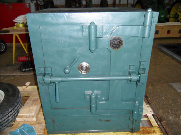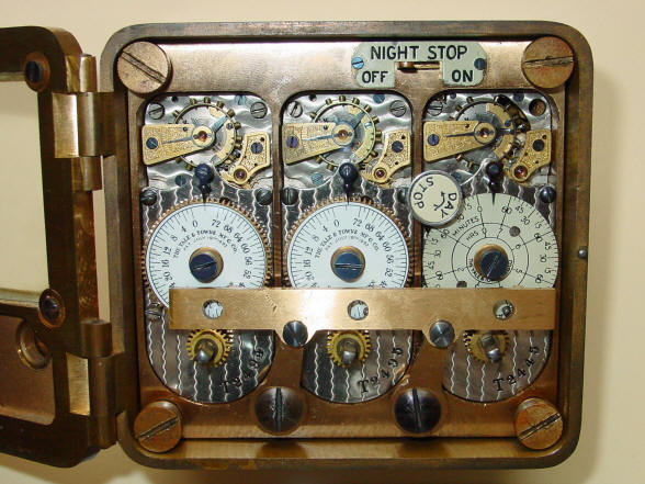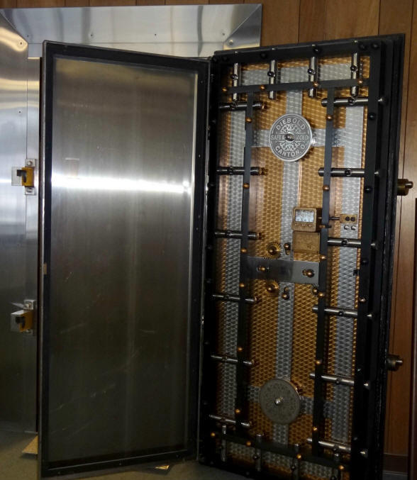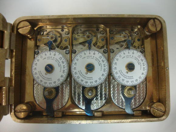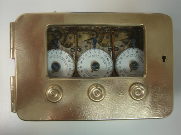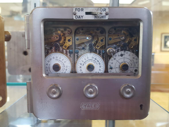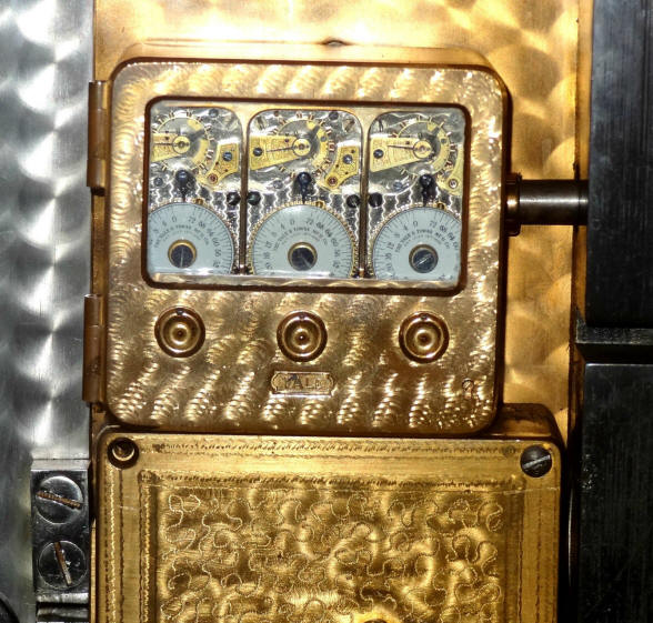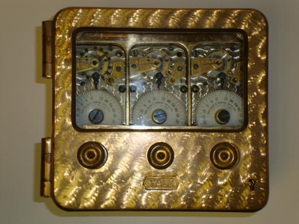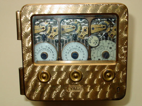 Notice the shape of the bolt dog in the photo above which closely matches the design in the patent drawing. A. Type T321 DAT (Delayed Action Timer) c. 1928. A rare dual purpose time lock based on a patent by Charles A. Miller as illustrated above. This timer contains two conventional Seth Thomas 72 hour Type T movements and one modified Type T movement that has a 7 hour duration. Type T movements were the smallest coffin style movements made for Yale. A day/night switch is provided to engage the 7 hour movement during the day time hours. This lock would fulfill two functions. The first to act as a normal overnight/weekend time lock; using the two 72 hour movements and the second to secure the vault for short period of times during the day, primarily in the event of a daytime burglary. The 7 hour timer could be set for intervals as short as 15 minutes and when the DAY STOP knob is set that movement is stopped via a light lever touching the balance wheel, therefore that movement is always in check for whatever amount of time has been dial in. In the event of a daytime robbery, the proprietor need only close the door, or more likely the door is closed, and then turns the bolt actuator to trip the third short-term movement; by doing so the bolt is dogged for the amount of time previously dialed into that movement. Obviously a daytime yegg (the term yegg is actually used in the patent description and is an outdated term, first seen in 1901 for a robber) will not be able to wait around for the time lock to run down. The NIGHT STOP switch is used to disable the third movement from being able to be activated preventing it from accidentally putting the time lock off guard in the middle of the night, and is switched off during the day to allow the DAY STOP feature to work. Obviously one can readily see a danger here. If one forgets to deactivate the DAY STOP by setting the NIGHT STOP it is possible to set the short term timer running and put the lock off guard in the middle of the night. To see another Yale with modified Type T movements click here. Below is a similar, but slightly later dated example. That lock lacks the additional "DAY STOP" knob where a drive gear is located and combines it into a single switch removing the problem of the lock being left off guard accidentally. Less than fifty of the first version were made, probably in recognition of this problem, with this being the only known three movement example. Case #242, movements consecutively numbered T2494, T2495, special timer movement T2445. 4 3/8" w x 4 1/8" h x 2 1/2" d. file 8 B. Type T321 DAT (Delayed Action Timer). c. 1933. Same functionality as example 'A' above; this example being one of three known so far. The difference between this model and the earlier one is the DAY STOP and NIGHT STOP functions are combined into one switch, eliminating the possibility of the short-term timer being actuated when the lock is meant to be on guard throughout the night. The timer contains two conventional Seth Thomas 72 hour Type T movements and one modified Type T movement that has a 7 hour duration. Type T movements were the smallest coffin style movements made for Yale. A day/night switch is provided to engage the 7 hour movement during the day time hours. This lock would fulfill two functions. The first to act as a normal overnight/weekend time lock and the second to secure the vault for short period of times during the day as described in example A. The 7 hour timer could be set for intervals as short as 15 minutes. To see another Yale with modified Type T movements click here. Below is a similar, but later dated example mounted into a safe door. Notice the Yale time lock advertisement on the door stating the safe is protected by a Yale time lock. There is also a photo of an identical model lock in the Harry Miller collection. Case #683, movements #T3307 , T3317, special timer movement #T3699. 4 3/8" w x 4 1/8" h x 2 1/2" d. file 257 The Mosler company also created a similar product in their Do-All®, Model D-A in 1938. There the time locks could be actuated for a selected period of 20, 40 or 60 minutes and used both of the regular 120 hour movements; making usage fool proof and eliminated the possibility of failure while a single movement was controlling the time lock as was the case in the Yale DAT series. Furthermore the short term actuation was accomplished by simply turning the combination dial. C. Type T321, c. 1907. This lock is equipped with Yale's smallest production movements the 'T'. Yale began to introduce its brass machine finished case to replace the earlier nickel plated damascened case around 1908. Yale began to order their T-movement in 1907, the low serial number on the case and movements makes this early in the production run. The lock was reputedly removed from the Honolulu Bank in Hawaii in 1941. See photo below for a similar lock mounted into a Diebold vault door. Case #109. Movements # T207, T475, T481. 4 3/8" w x 4 1/8" h x 2 3/4" d. file 146 D. Type T321, c. 1920's. Same as 'B' but a bit later version using the satin silver finish. Case #271, movements consecutively numbered T2988, T2989 and T2990. 4 3/8" w x 4 1/8" h x 2 3/4" d. file 86 E. Type T322, c. 1908. This is a wider case format of the triple gang time lock using T movements. Why Yale would use a larger case when everything was otherwise the same as their smaller version depicted in example 'B' is unknown. Probably there was an application where the height was critical since this case is 7/8" less in height than examples A through D. This also necessitated the design of the very low profile snubber bar seen on the bottom of the case as opposed to the more conventional design over the front of the time lock dials. It also required the addition of the blued metal trip lever 'tail pieces' to connect to that snubber bar rather than being driven by a pin on the time lock's indicator dial which was Yale's standard design. Notice in the third photo how Yale 