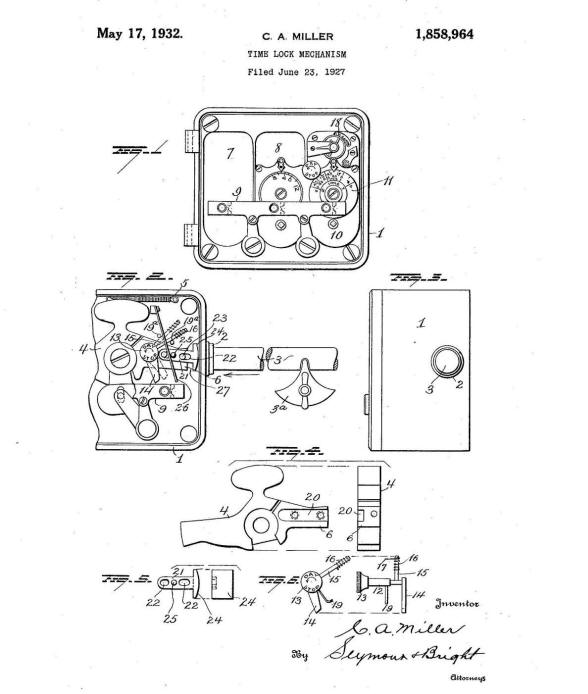 The first drawing shows Charles Miller's design to retrofit the Yale Model T321.This was thought to be the only type of lock Yale applied this design to until the discovery of a Yale Quad K DAT. The second drawing shows another patent filed for the retrofitting of a Sargent & Greenleaf Model #4 to accomplish the same purpose of a short term, quick, emergency way to put the time lock on guard, but there is no evidence that S&G ever adopted it. An interesting observation is that the S&G model depicted in the 1933 patent drawing is the earliest S&G Model #4 made between 1879 and 1884 as evidenced by the dial and Geneva stop design. Eventually all of the mainstream manufacturers designed a specialized time lock for short term, intraday protection, S&G in their timebination series of locks in 1936, followed by Mosler in their Do-All® series of locks and Yale's 6200 series.