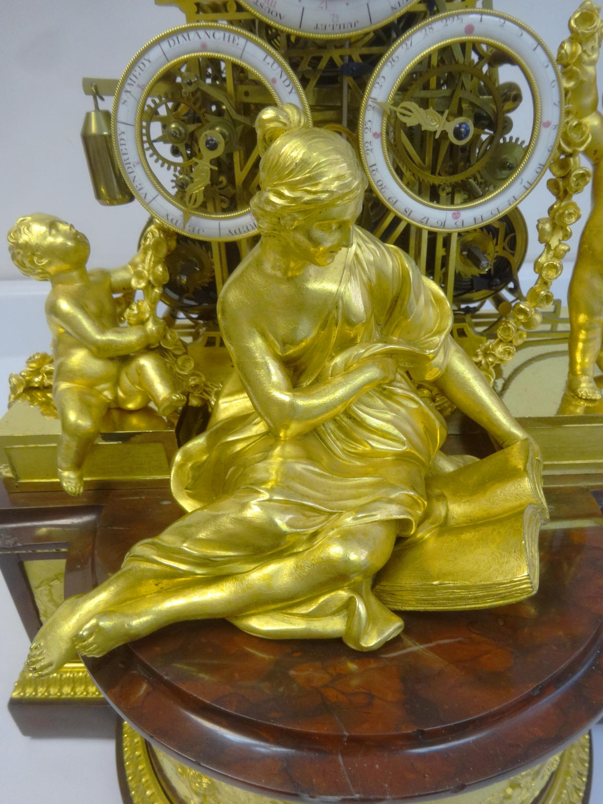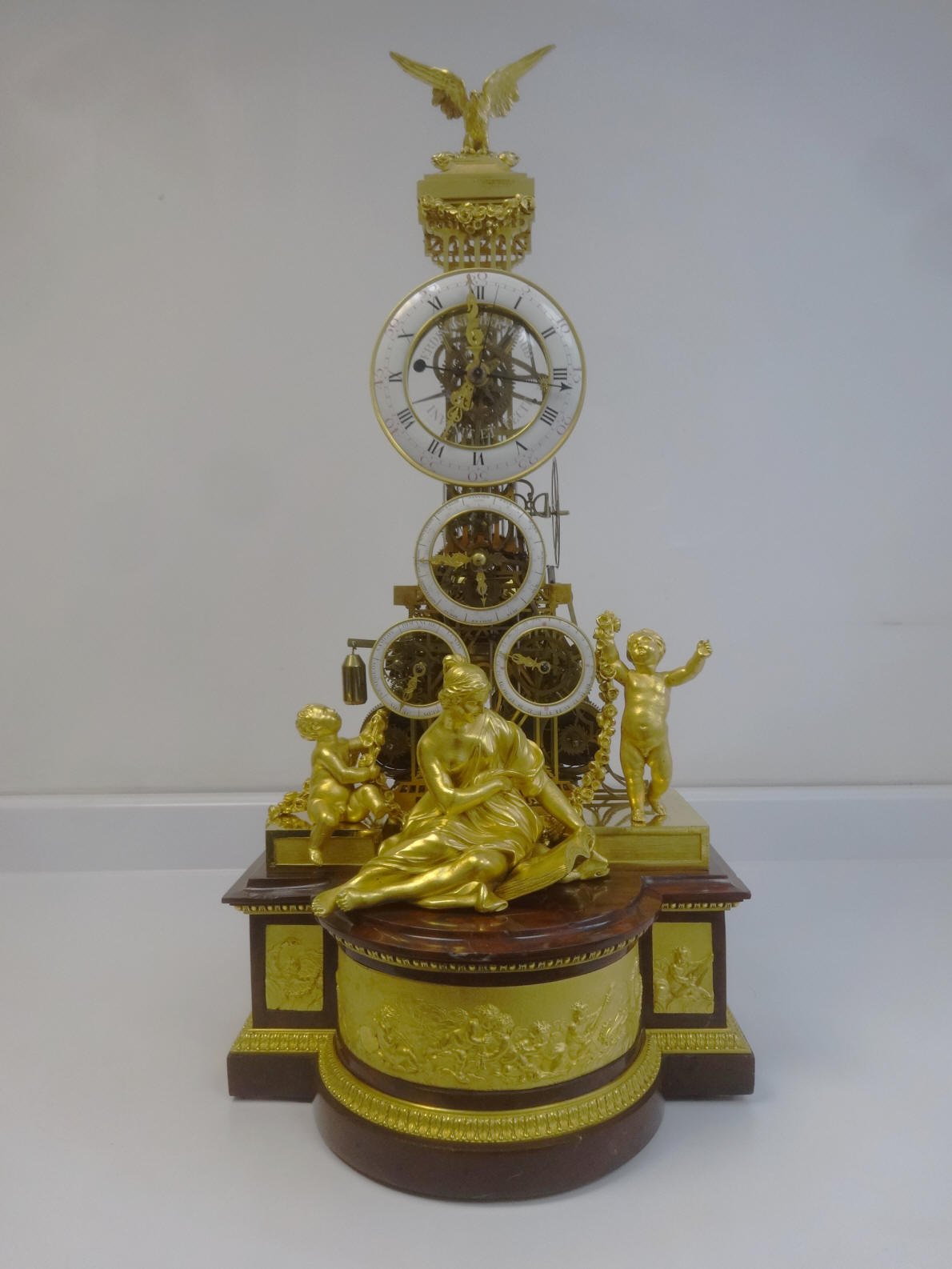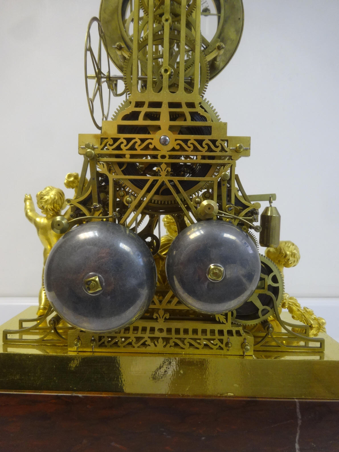 dials have gilt inner and outer bezels. The base is a rouge marble with gilt