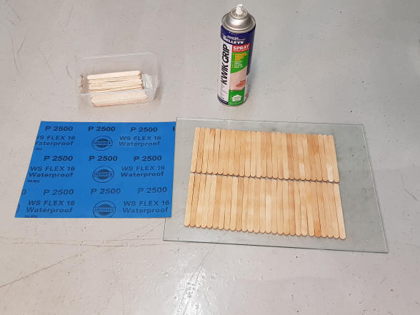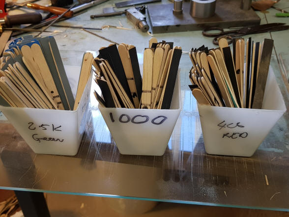 are glued to the sand paper and then cut with a Stanley knife on a scrap