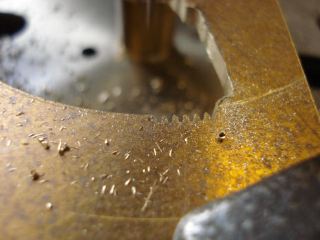 These two photos show the tooth cutting progress, note the cutting wheel