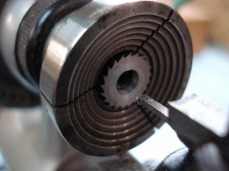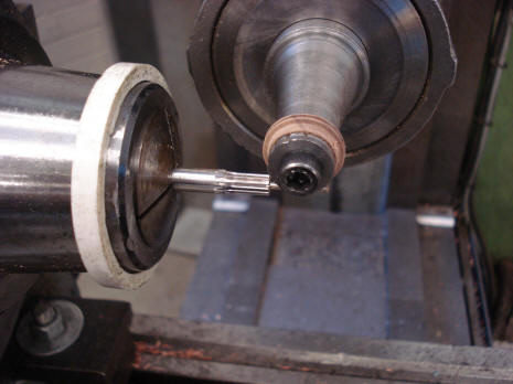 Buchanan polishing the pinion teeth with a wood blank charged with polishing