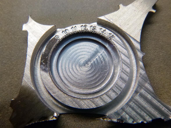 cursive engraving. Next the dial labels and integral bezel are complete and