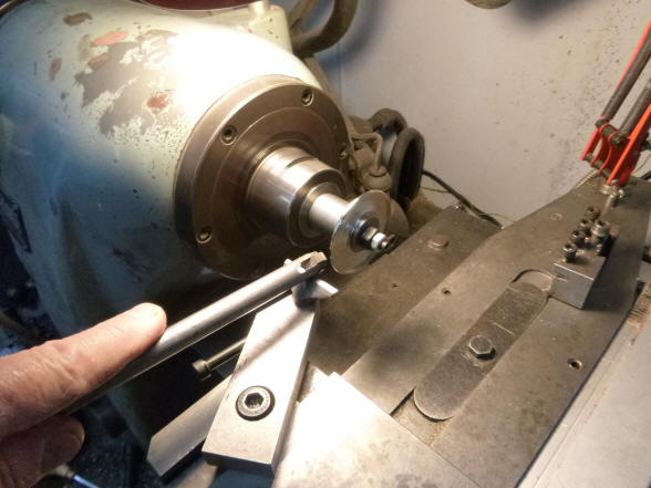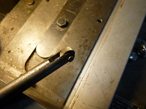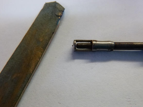 slitting blade. The screw is held in a lathe collet and the blade is run