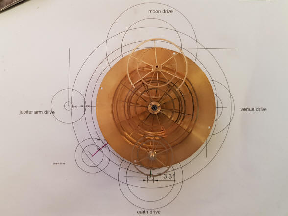 I refer to the e-drawing top and side view, the main orrery drawing and the