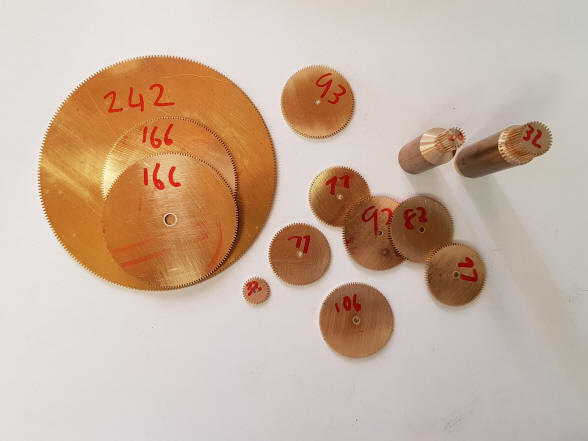 I have the next 9 gears cut for the outer arbours (second photo). There will