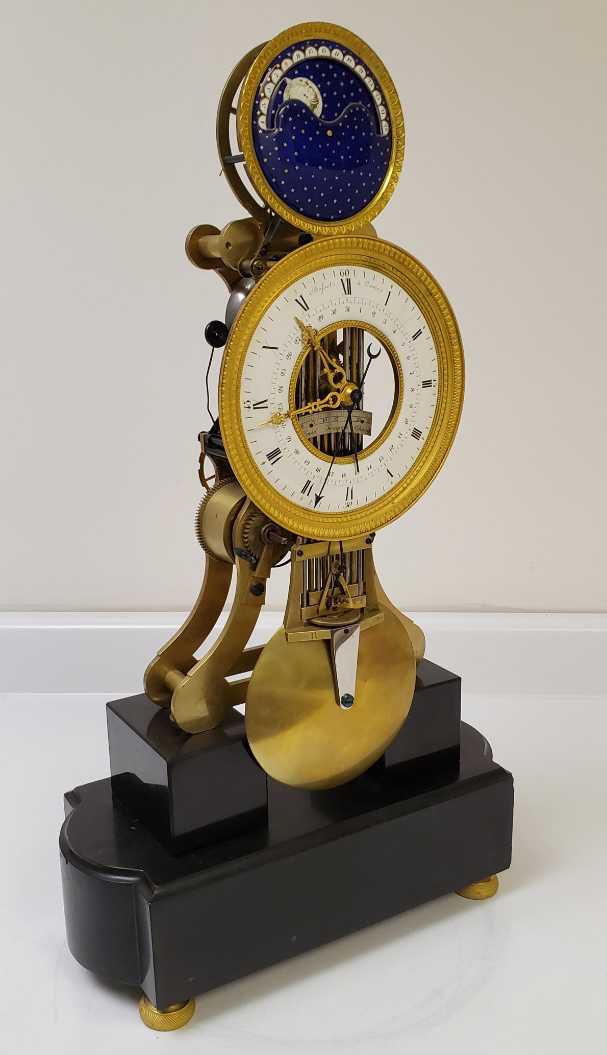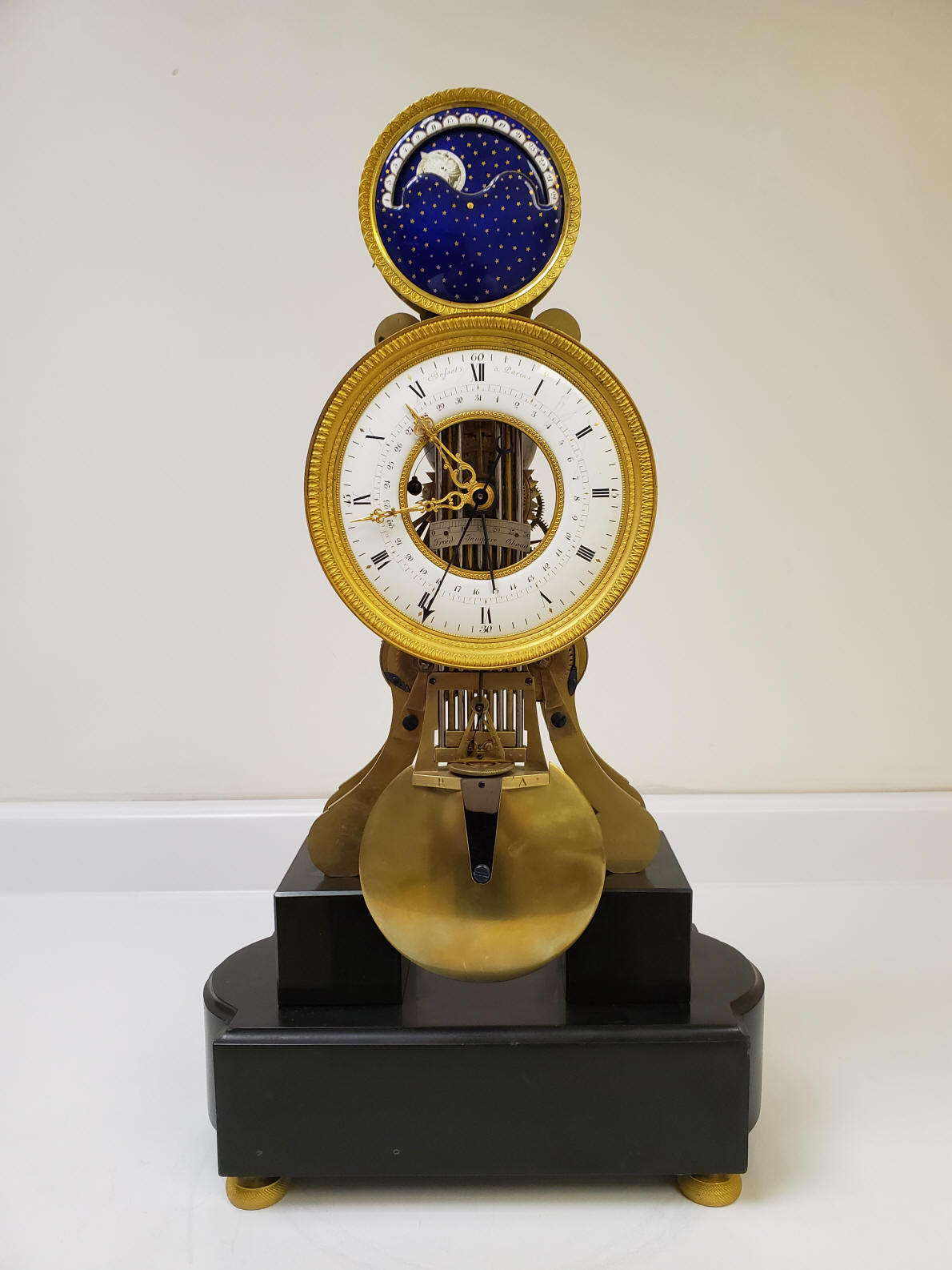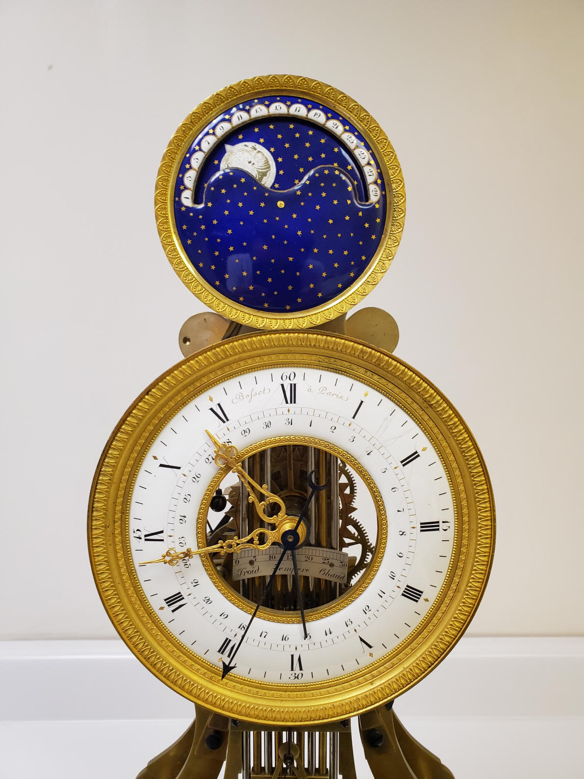 Bosset, Paris, France, c. 1815, Two train, hour strike and half hour strike on count wheel. Two week duration. Half second gridiron pendulum with temperature scale suspended by spring between motion work and dial, crutch with micrometer beat adjustment. Movement with pinwheel escapement planted on rear plate having 60 pins allowing the second hand to move one revolution per minute. Inverted "Y" frame mounted on substantial black marble base. Gilt dial bezel with enamel roman chapter ring and calendar ring, pierced gilt hands and blued center seconds and calendar hands. Surmounted by subsidiary blue enamel dial with aperture for age and phase of moon. 21"h x 12"w x 6.5"d. Click on first two photos for more details