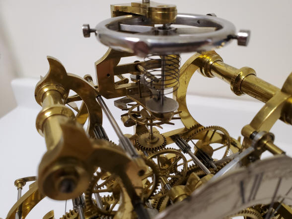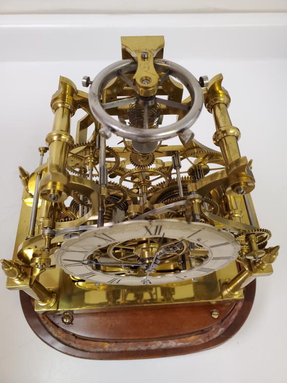 snail system. bell located in wooden base. Jeweled lever escapement. Movement is 10" h x 7" w.