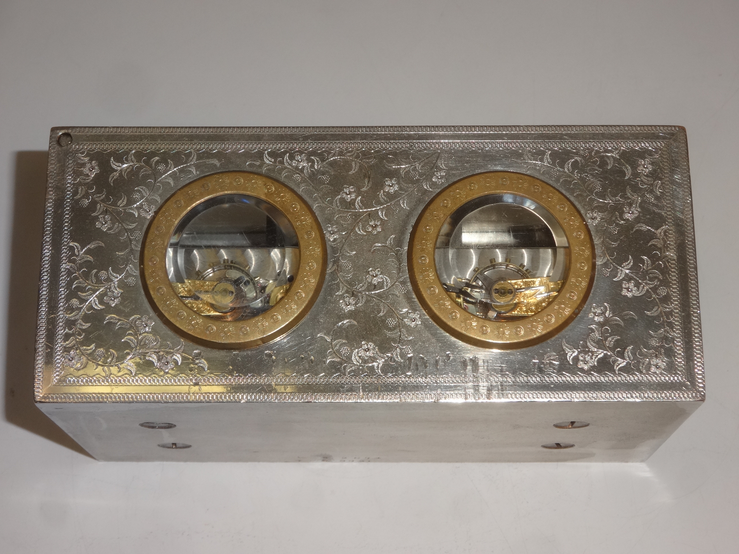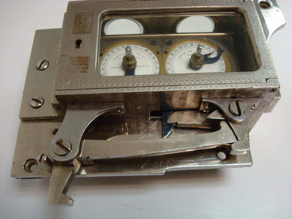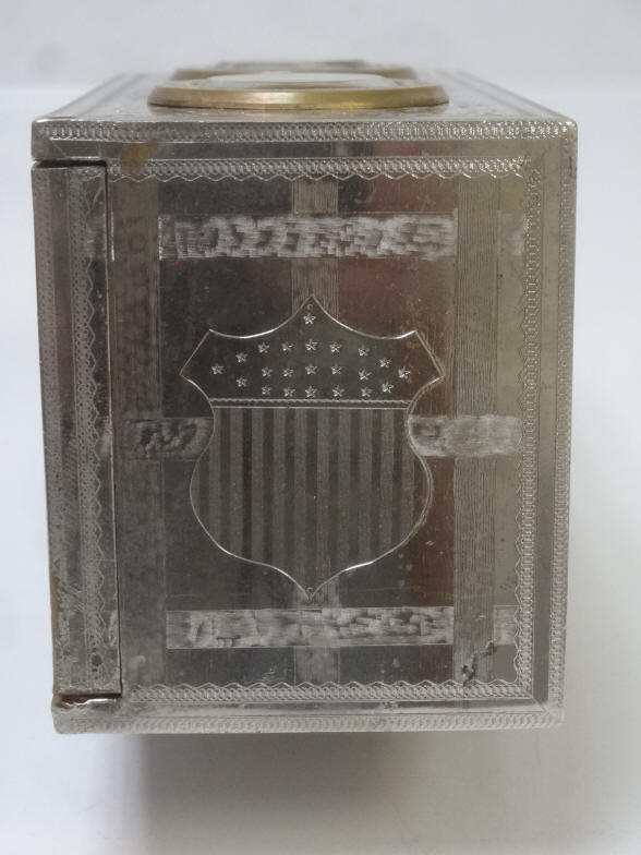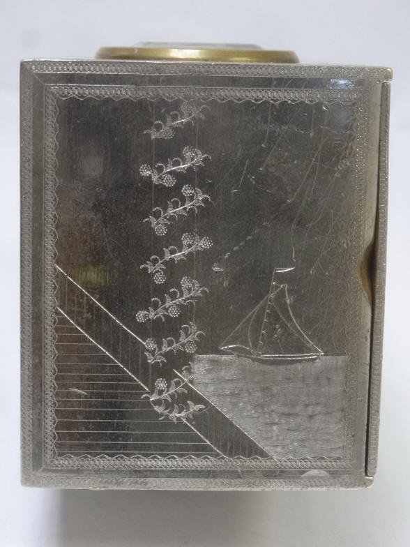 preset the time lock before closing time. One could adjust the pointer to allow the time lock to go on guard at any hour before the normal time that the safe would go off guard. For example, one could set the pointer for three hours from whatever time the time locks were currently running, lock the safe and be sure that no one else could open the safe even with the correct combination until that time. This could be done only once until the right hand timer ran out to the desired time before being reset. Another example of intraday functionality is the very complex Yale #1 which allowed one to do this exercise this capability to within one hour throughout a 24 hour period! This is an example of one of the first time locks made by Joseph Hall under the newly incorporated Consolidated Time Lock Co. in 1880. Hall needed a separate corporate entity to manufacture time locks in order to shield his existing safe and vault business from the litigious environment that surrounded the time lock business at the time. The company began operations in January 1882. This time lock can be accurately dated to 1882 because the case is slightly wider by about a three-quarter inch from all models produced after October of 1882. The forty-eight hour movements in these early time locks have a concentrically circular engine turning on the front plates, which was later replaced by the more common wavy vertical damascening. One hundred of this model were made but only two of the earliest wide-cased Consolidated time locks are known to survive. This is also the only wide cased example known to have the elaborately hand engraved side panels and floral engraving. This type of engraving was found sporadically on Consolidated and Dalton (also part of Hall's Safe & Lock Co.) cases from this period continuing though about 1886. The theme to the engravings may be the Ohio River region with subjects known to include sail boats, ducks, cranes, hunting dogs, boys fishing, and a country gentleman with a fishing rod. One can easily imagine that Mr. Hall was an avid outdoorsman and had his favorite activities immortalized on a few of his special time lock cases. The work may have been done by the same artist given the consistent appearance of the associated floral vine engraving. Eight folk art engraved examples are known. Later side panels were machine engraved in a circular guilloche pattern. This is the same lock as featured in John and Dave Erroll's book, pages 214-217. (1) The lock also has an optional intraday locking device located on the right hand movement allowing the operator to automatically put the lock on guard at any time. In this way one could leave the safe alone earlier than usual with the lock going off guard at the normally set time. See video above for a full explanation of this device. 5 7/8"w x 3"h x 2 5/8"d. Case #3021 stamped on rear with #228 stamped on door, movement #3021. file 204