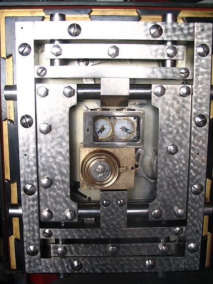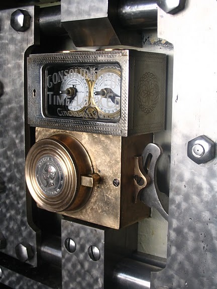 B. This lock employed the rare E.J. Woolley patent design that allowed the firm's time lock to operate in the more conventional manner, that is on the safe's automatic bolt work instead of the combination lock, c. 1886 . This allowed for it to be used alone without a key or combination lock as was becoming popular at the time. The lock is also equipped with the rarely seen optional longer duration, 78 hour movements. Fewer than 100 were made between 1886 and 1887 and only four complete examples as shown above are known to survive.(2) Case#6412, movement #6412, all bolt work parts #73589. file 121 The photos below show a Consolidated time lock on three different safe doors. The first two safes have the time lock acting upon the combination lock. The last photo shows the same type of time lock attached to a Consolidated bolt motor which allows the time lock to trip the motor and automatically throw open the bolt work. This eliminated the need for a combination lock, or a manual bolt crank; leaving the surface of the door completely solid. This eliminated the openings needed for a combination lock and bolt crank which could be used by a competent safe cracker as a venue to undermine the safe's security. The downside to this design is the fact that the safe is automatically opened at the appointed time and anyone present at that time can open the safe. So this type of configuration only worked in a secure environment. The last illustration was included to show the unusual sideways mounting of the time lock as well as a very large single-cased dual combination lock. Normally, larger-sized, dual dial arrangements would be two separate cases of single dial combinations locks connected together externally rather than internally within one enclosure. If one looks carefully this is the very old style of Hall time lock as the door has the scalloped corners as shown here. The photo was taken from a publication issued for the 53rd Congress, 1893. Report to Secretary of the Treasury on Improving Vault Facilities of the Treasury Department. It is a primmer on safe cracking and a fascinating read on how many ways and how quickly a talented safe cracker can open nearly any safe made in the day. This photo was taken after several 4" holes had been drilled to demonstrate that such a hole can be made using a hand drilling apparatus in under four hours. The publication even shows how one can make liquid nitroglycerine from dynamite! The one model of safe that was impervious to safe cracking within the time necessary before the normal opening of the business was the Corliss planet safes.