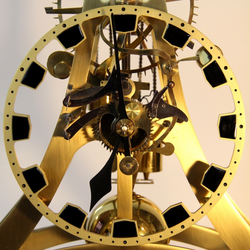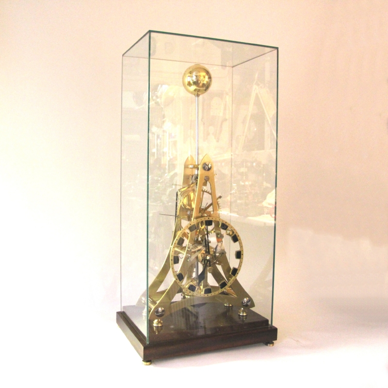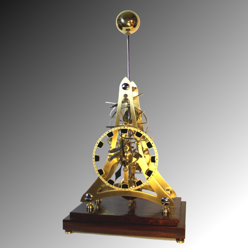 Original clock seen in background by Martin Burgess commissioned for Simon Napier-Bell seen here who was a manager for pop-rock bands in England. It was approximately three times the size of the Dent and the frame made of wrought iron. This was one of a series of skeleton clocks made by the Edward Dent company in the 1970's. Some were replicas of skeleton clocks made by famous makers in the prior century. Two examples of these Dents in my collection are the Rolling Ball clock by William Congreve, and the epicyclical clock by William Strutt. In contrast, the clock illustrated below is a 2/3 sized version based upon a contemporary, original design by Martin Burgess of England, now in a private collection. He has written an informative article which appeared as the cover story in the Horological Journal, August 2001 about the restoration of the original clock. This Dent version was featured on the cover of Clocks Magazine, August 1973. and there is also an entry in British Skeleton Clocks, Derek Roberts, pp. 204-206 it also has drawings showing the grasshopper escapement. About 25 of these were made in the 1970's. I know of 6 of the original production in existence. Sales were poor. Fred Whitlock produced 25 of these clocks based on a design by Martin Burgess. The clocks sold for £2,000 at that time, about $7000, more than the cost of an upper class car, quite a bit for a replica clock. Whitlock had issues with keeping to budget and Dent would not be flexible, so cancelled the order at No 25 (from an original 100). Whitlock had a further ten clocks, unassembled which came to light around 2000. This clock is one of those final ten that has been put into service. It is interesting that Whitlock was also employed by Dent to make the Congreve clock, epicyclical clock. The clock has many unusual features. It has John Harrison's 'Grasshopper' escapement which is fascinating to watch and gets it's name from the way the escapement kicks away from the escape teeth like the leg of the insect. It also has two types of remontoire, also known as 'constant force escapement'. One is Harrison's escapement spring remontoire (also used by the Schwalbach tower clock) and the other an electrically driven version of Christiaan Huygen's endless rope train remontoire. A remontoire is not properly an escapement but a constant force device used to deliver an even and constant power to the escapement and simultaneously separate it from errors that may be produced further down the wheel train. These were used rarely, and only on expensive, high quality clocks. It was most useful in tower clocks. See the tower clock section for more in depth discussion of remontoire and their applications. For escapement remontoire as is used in this clock see Schwalbach tower clock. For train remontoire see Wagner, Paris. When I purchased the clock, it had a mis-cut remontoire daisy cam causing the clock to stop. I re-cut part of the cam and it has been running without incident since. The design is highly stylistic and was made to maximize visual appeal. This is in keeping with Mr. Burgess designs in which his clocks are often called 'sculptural' in their appearance and function. The spring remontoire detent advances the escape wheel every 20 seconds while the electrical remontoire rewinds the weights which power the clock every 10 minutes. The pendulum is compound, on a knife edge suspension and has a two second period which produces a slow, hypnotic movement. I used this slow cycle as an inspiration for my Astro-skeleton commission seen here: https://youtu.be/ojdmaUYZNR8 . |