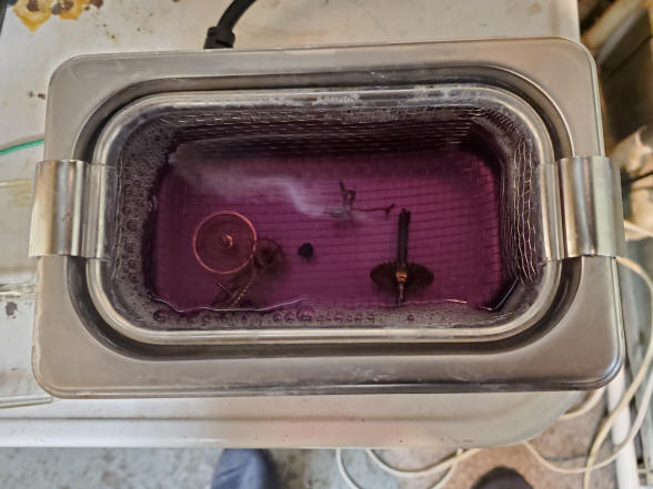 Movement components are first cleaned and then rinsed in the ultrasonic