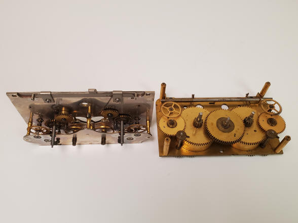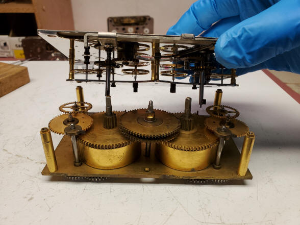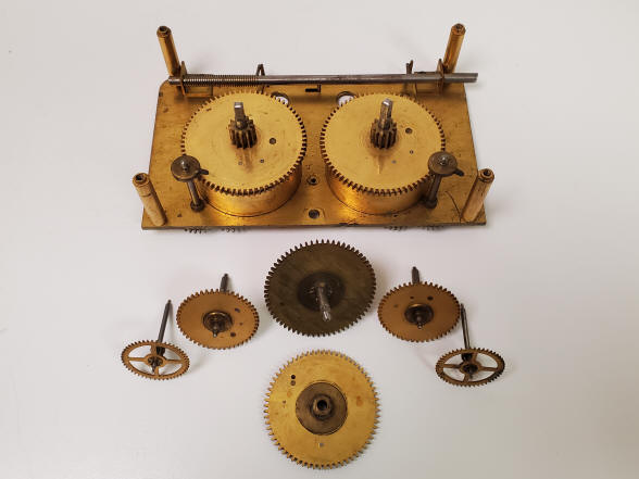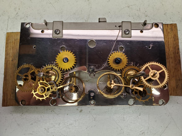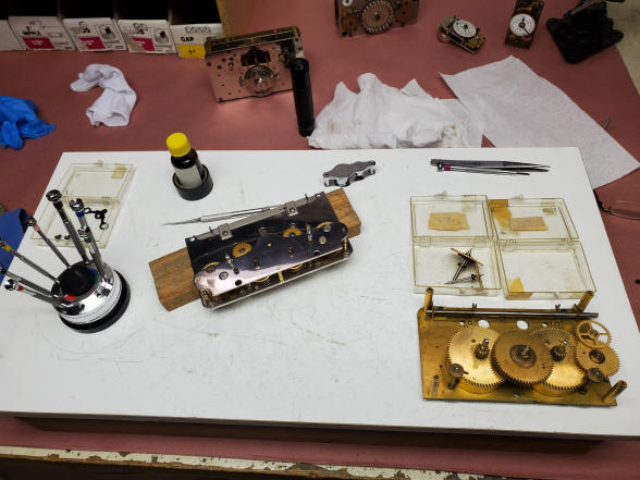 The drive clockwork partially disassembled. Next the escapement parts ready